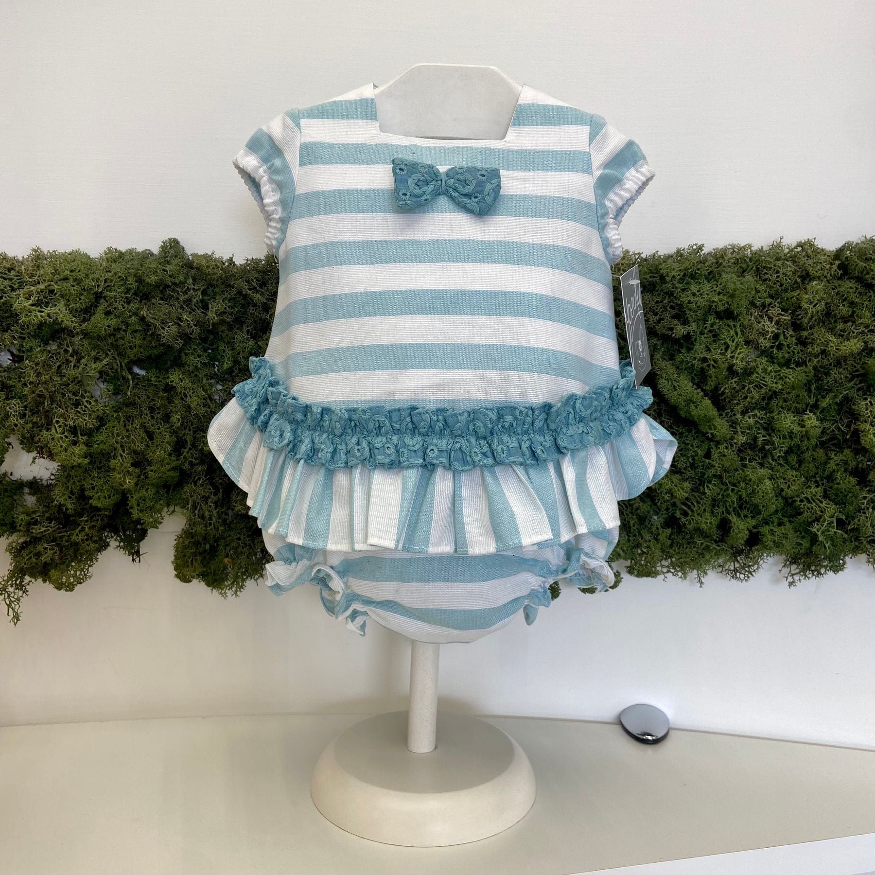 Completo due pezzi con culotte e con fantasia a righe.Abbottonatura sul retro.