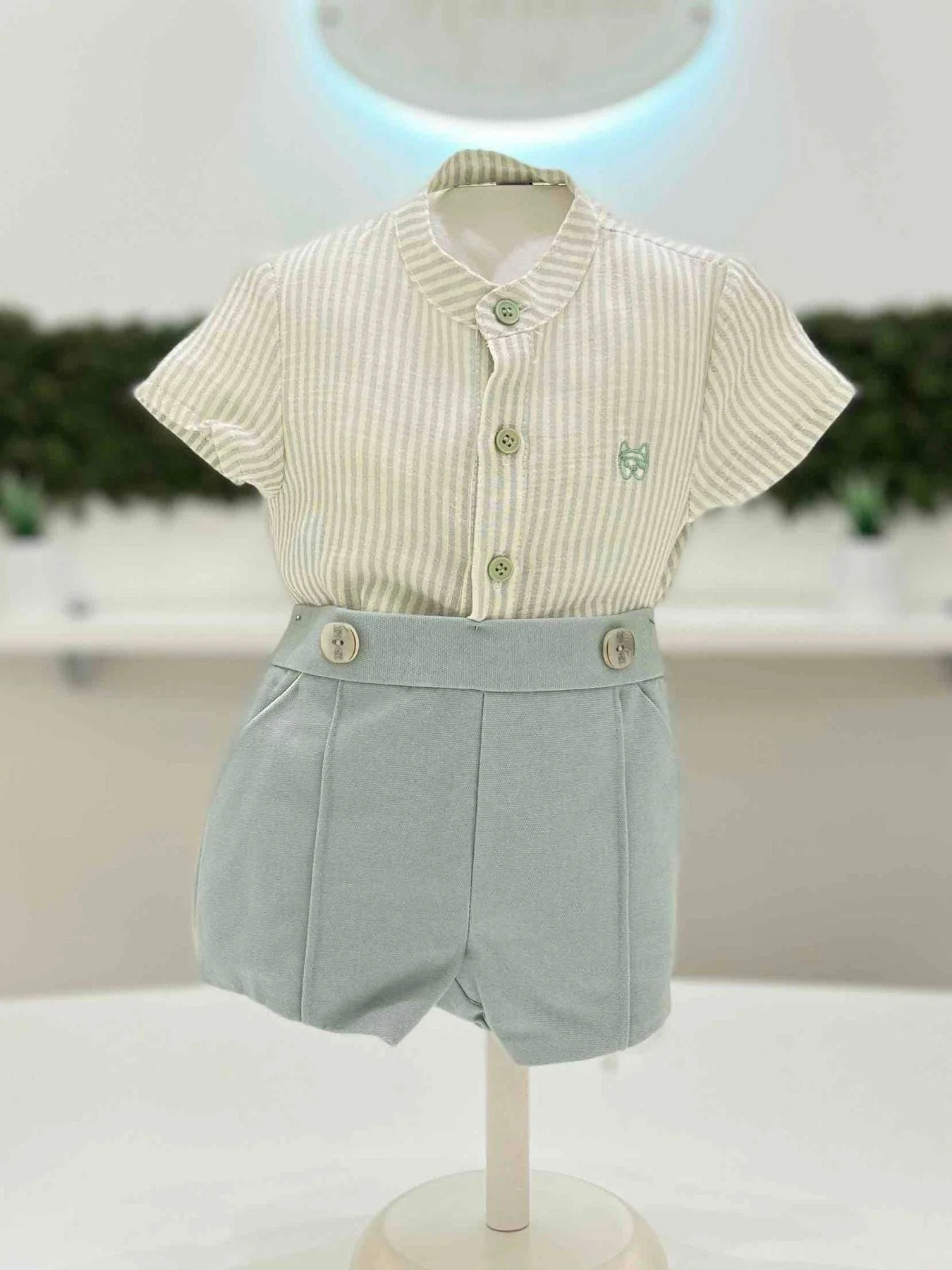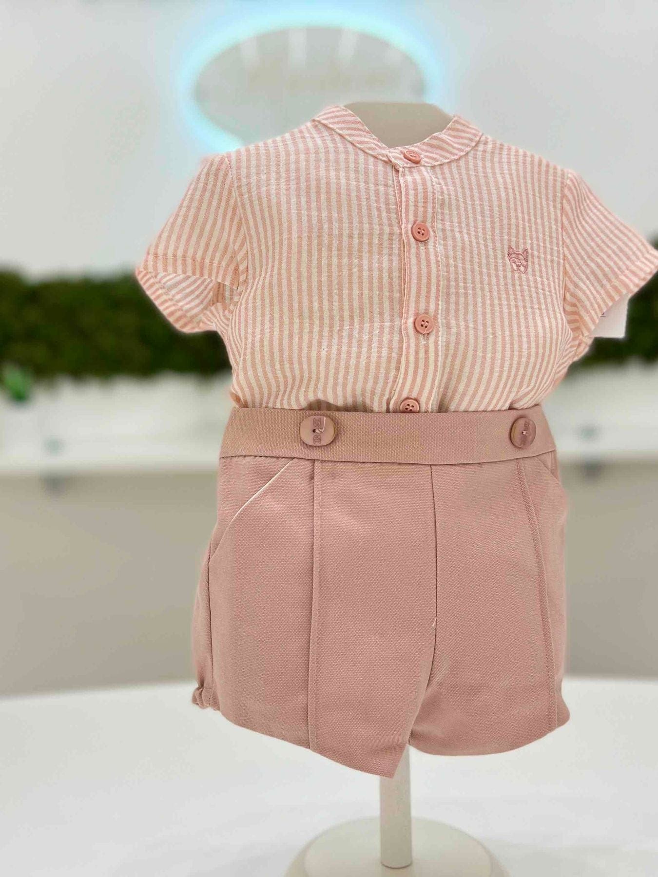 Completo neonato camicia e pantaloncino in cotone a righe.