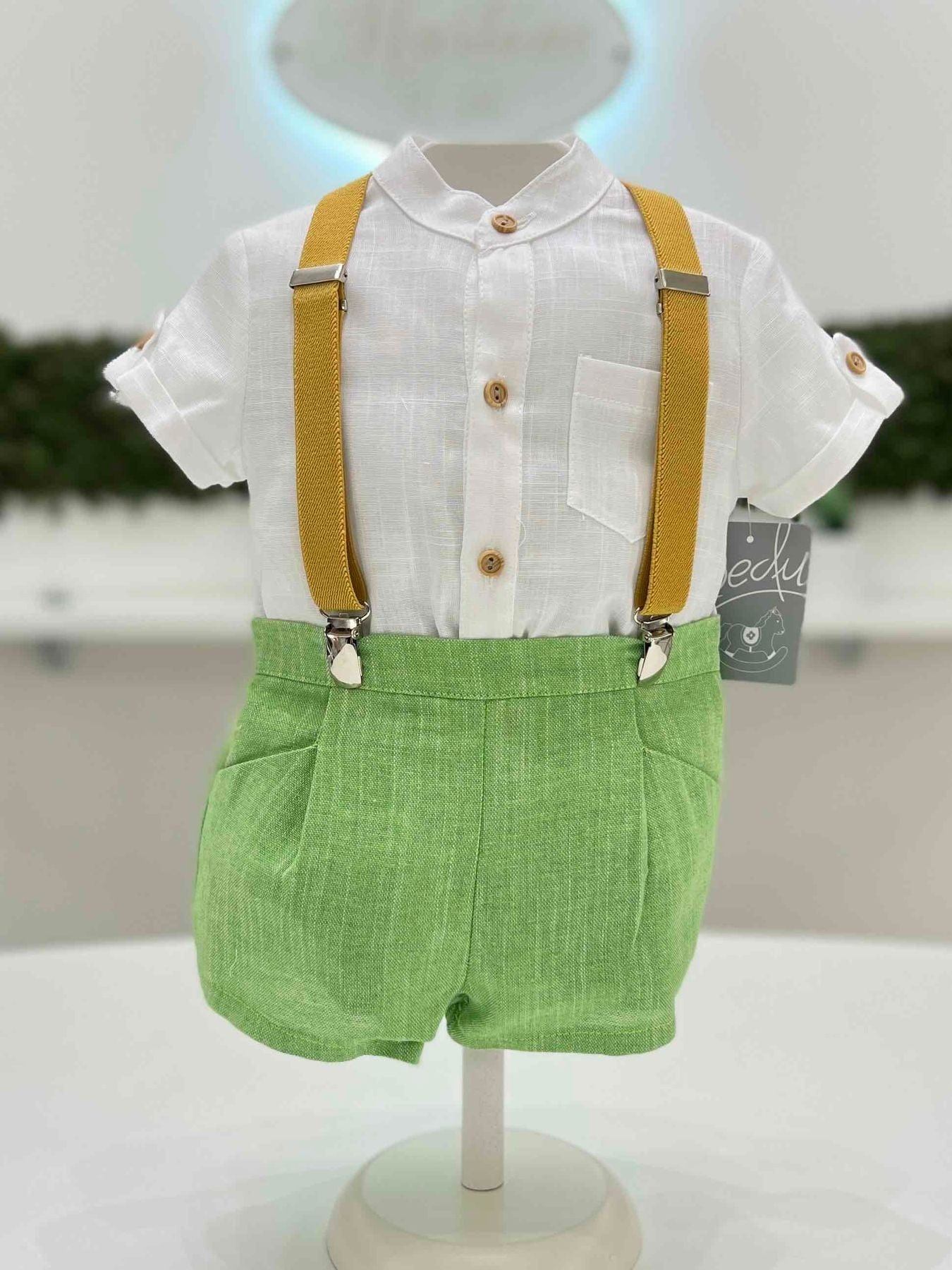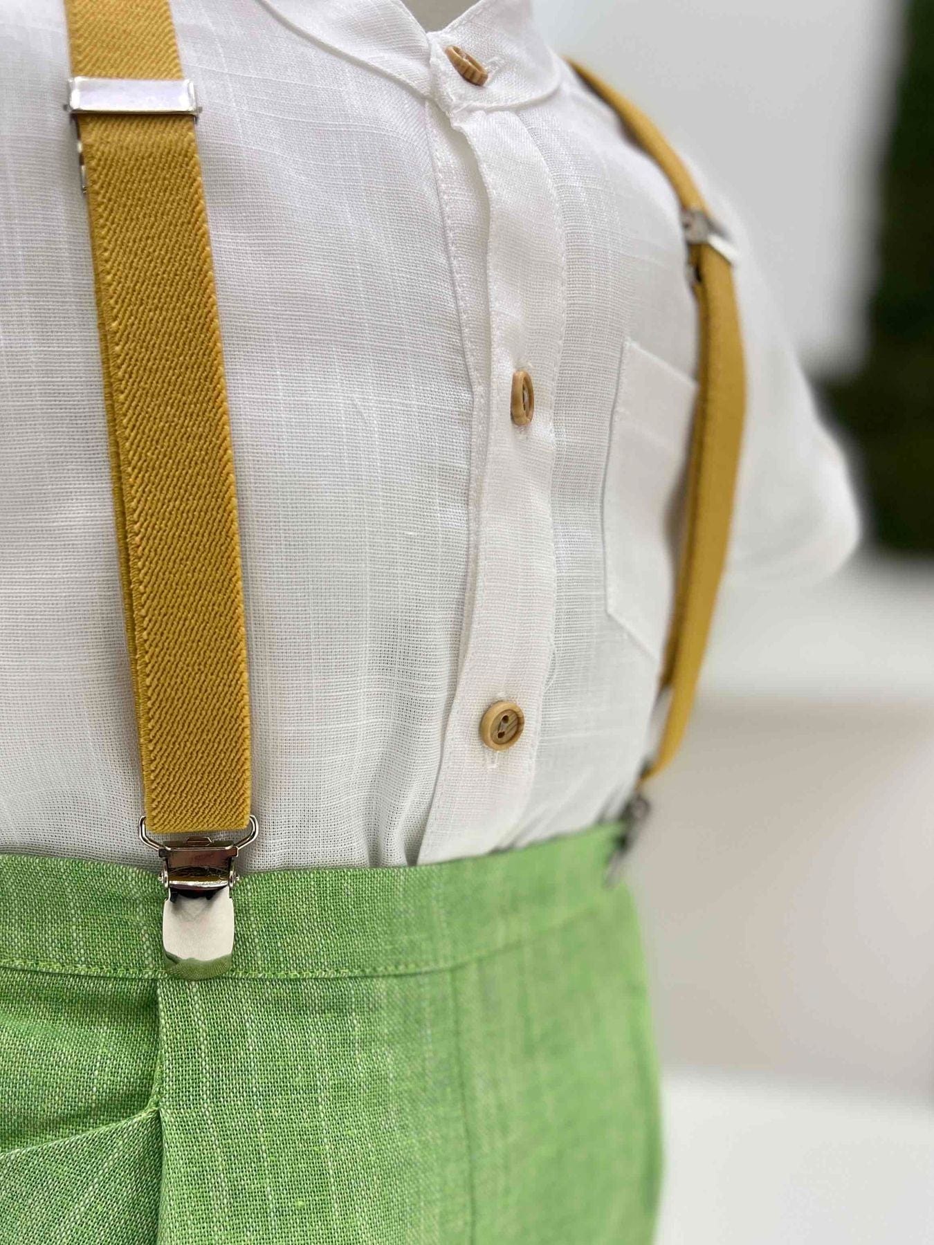 Completo tre pezzi con camicia in lino manica corta con taschino, bermuda e bretelle.
