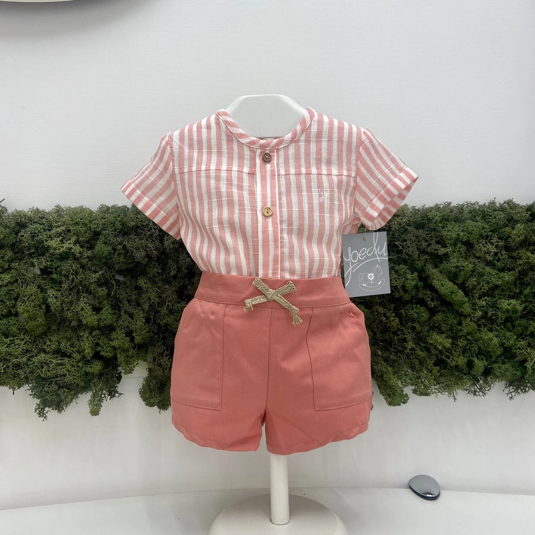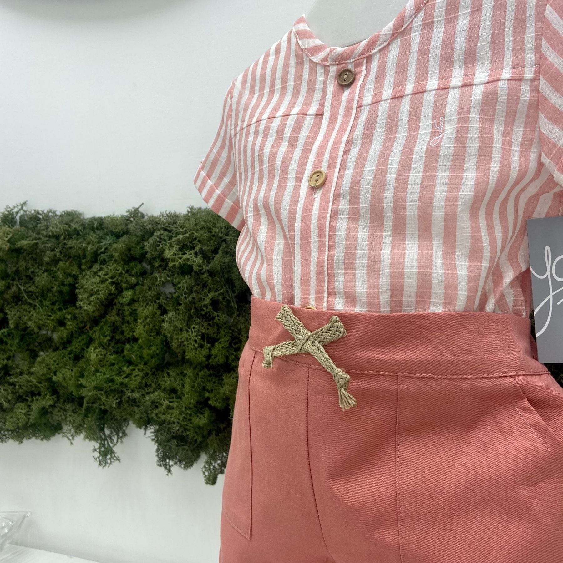 Completo due pezzi con camicia a righe e pantaloncino con elastico sul retro.