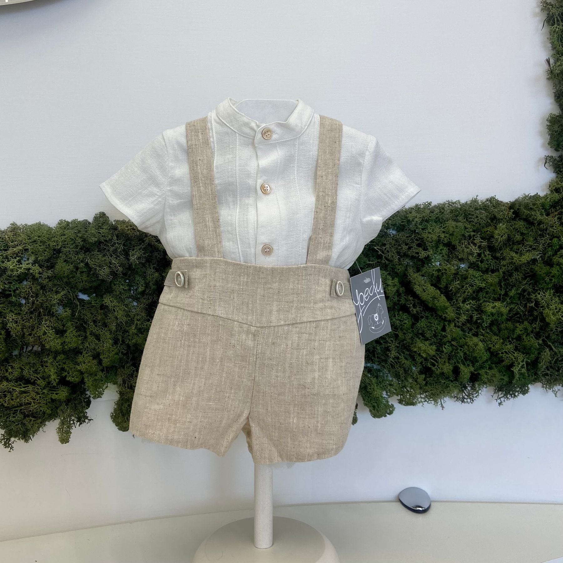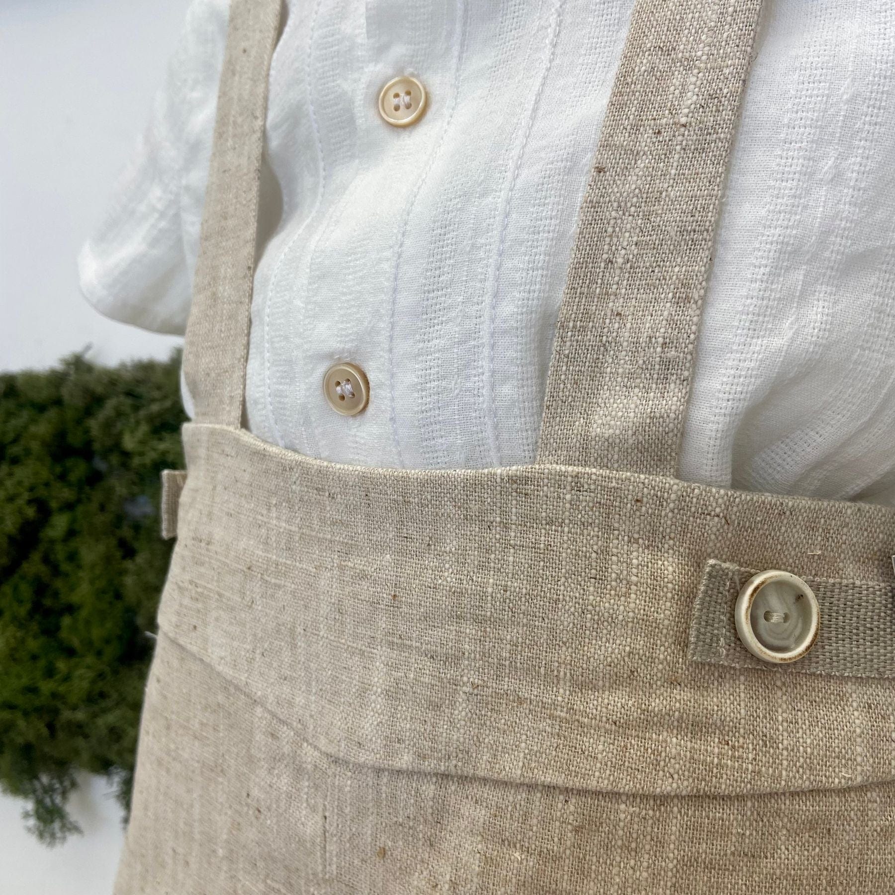 Salopette in lino con camicia operata.