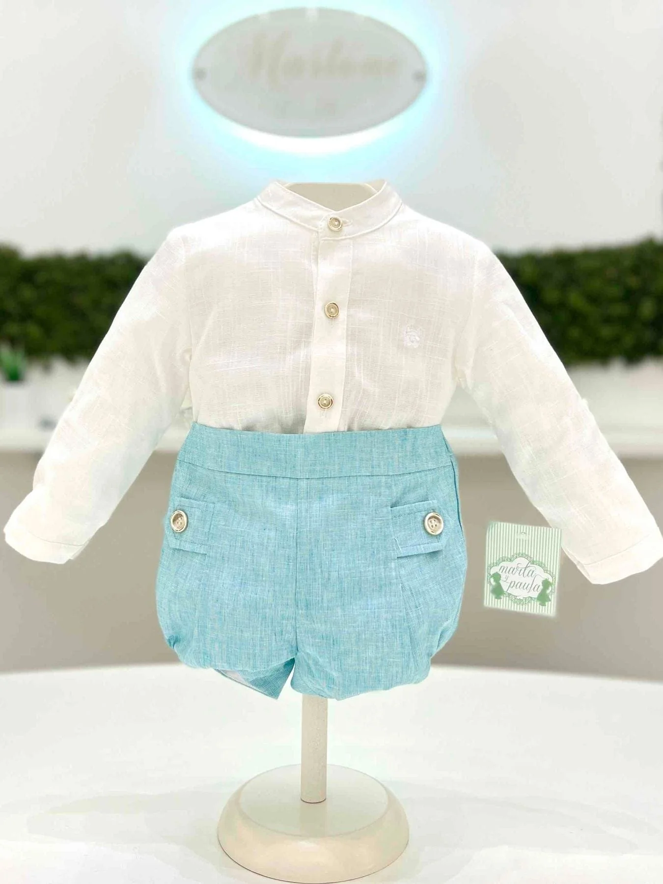 Completo due pezzi con camicia in lino a manica lunga e pantaloncino.