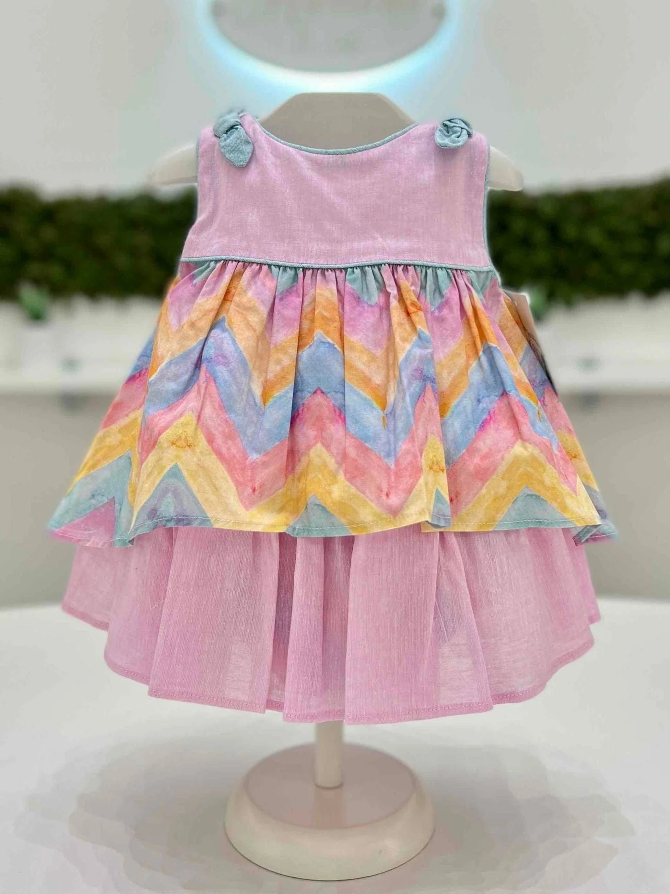 Abito neonata in cotone con coulotte, a balze e con fantasia multicolor.