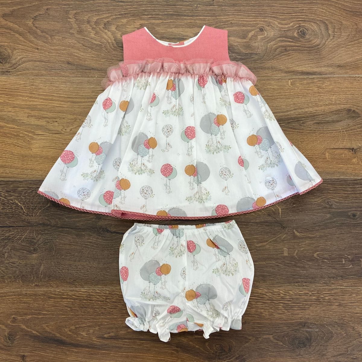 Abitino con culotte, con corpetto monocolore e gonna a fantasia.