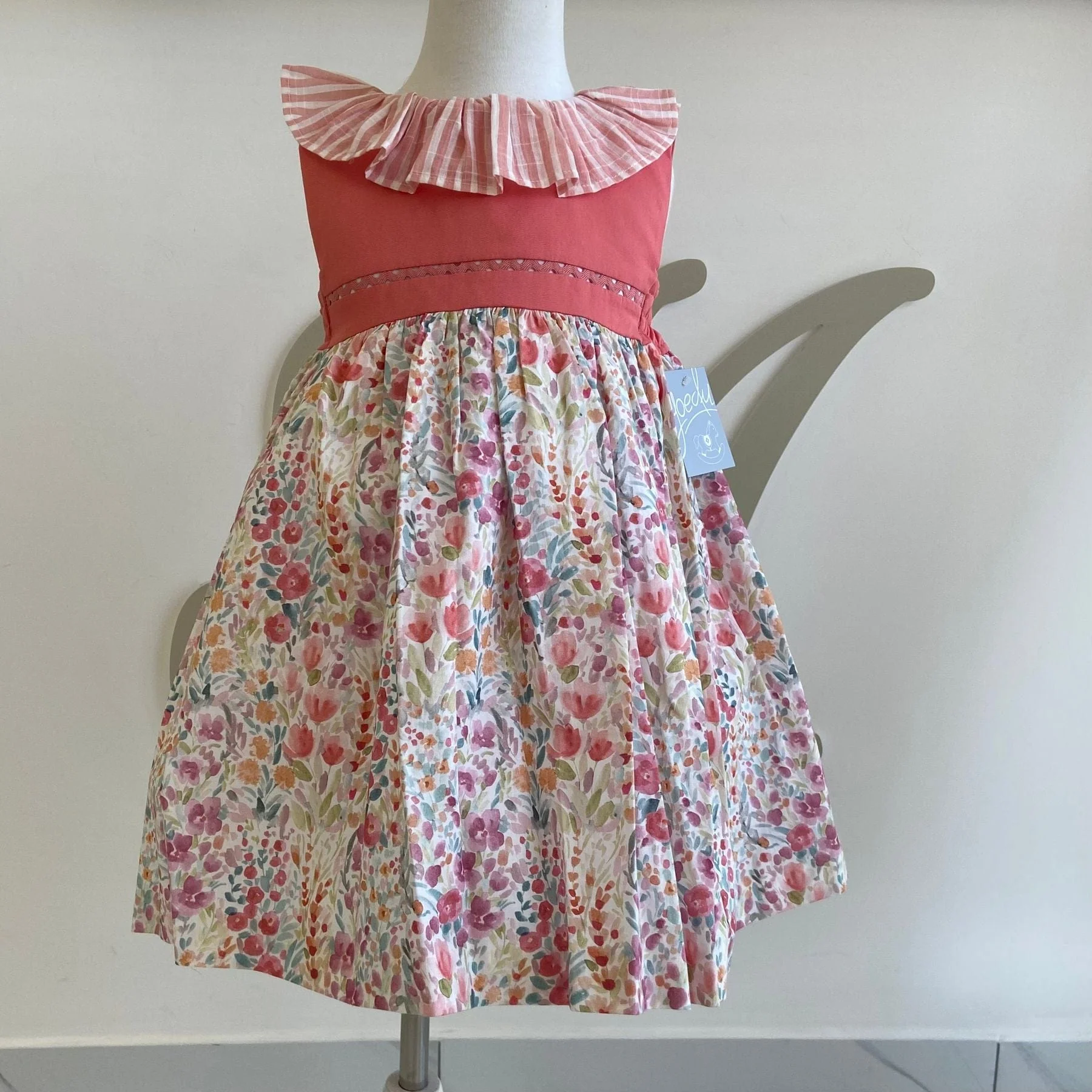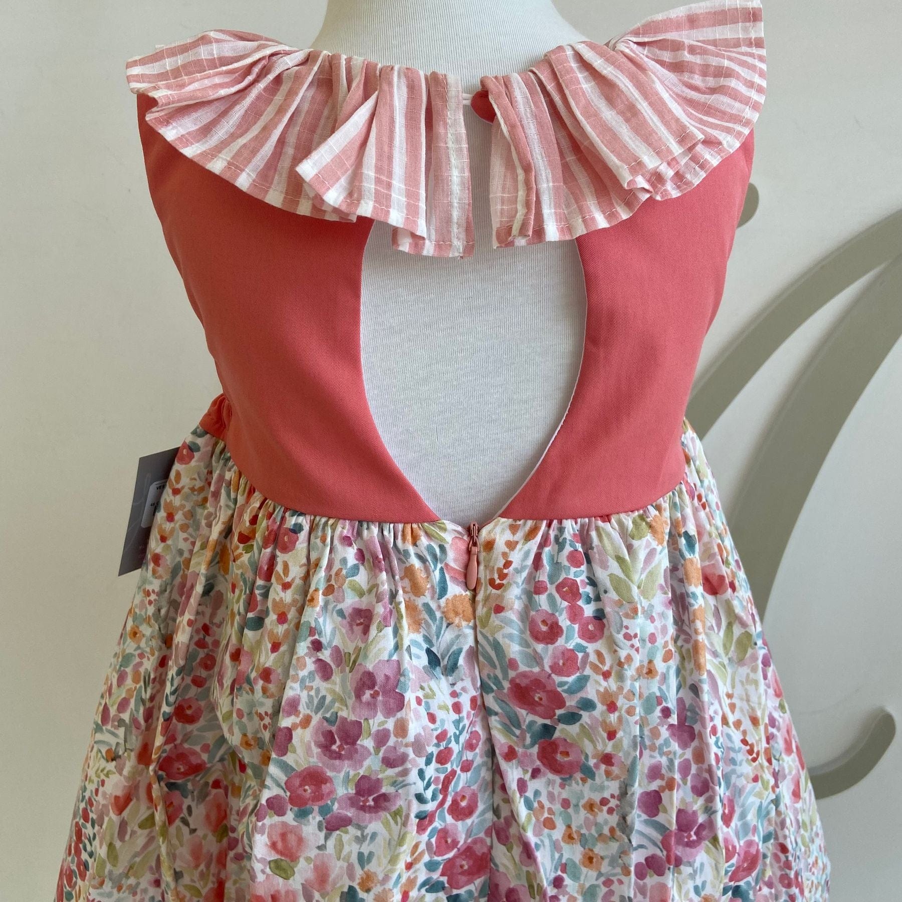 Abito con fantasia a fiori e corpetto tinta unita con collo con rouches a righe.Scollo sul retro.