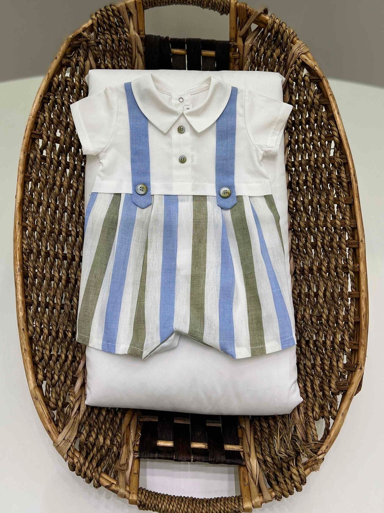 Tutina neonato a pagliaccetto 100% cotone, con fantasia a righe e finte bretelle.