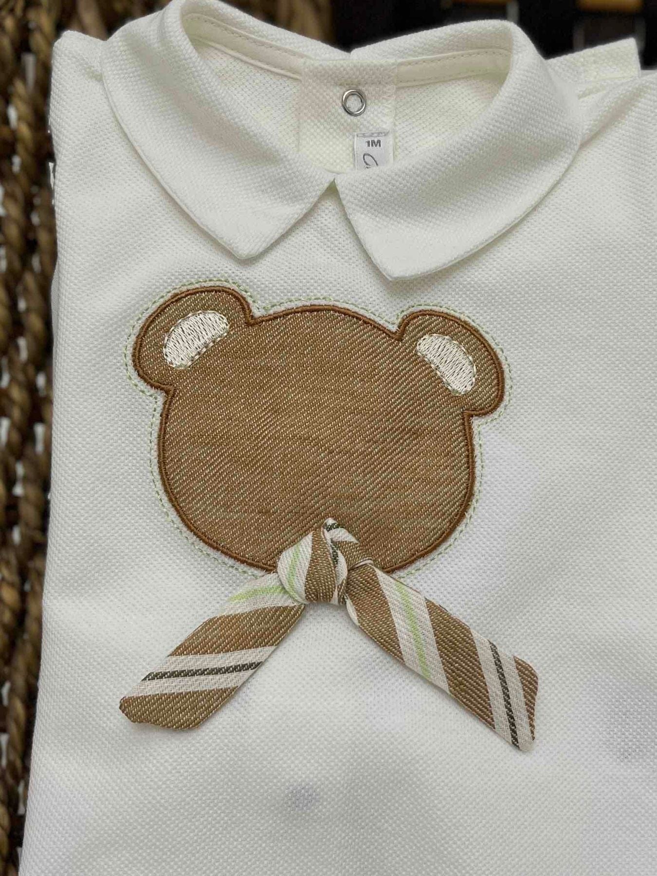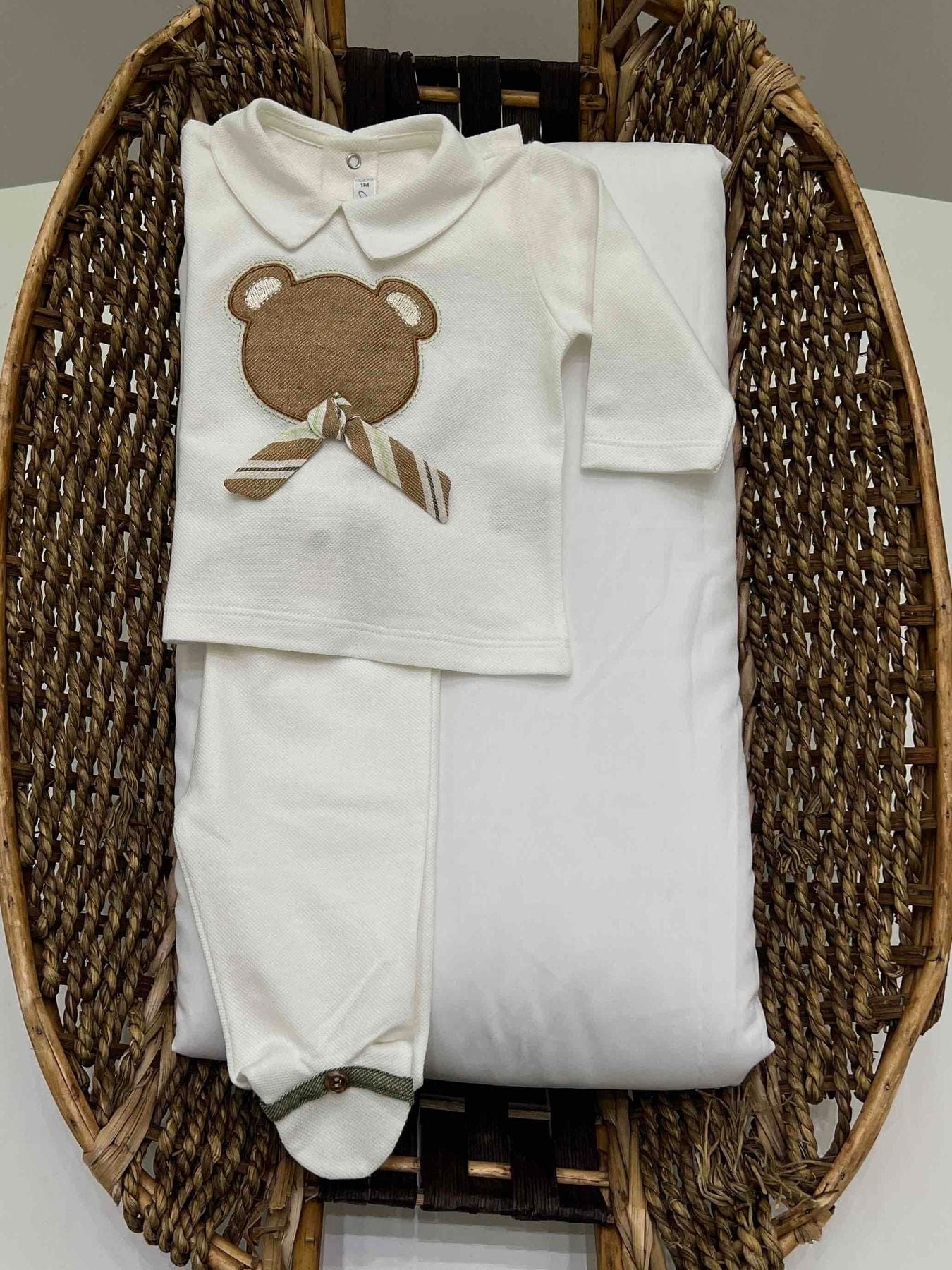 Completo nascita neonato 100% cotone due pezzi con colletto rotondo ed orsetto.