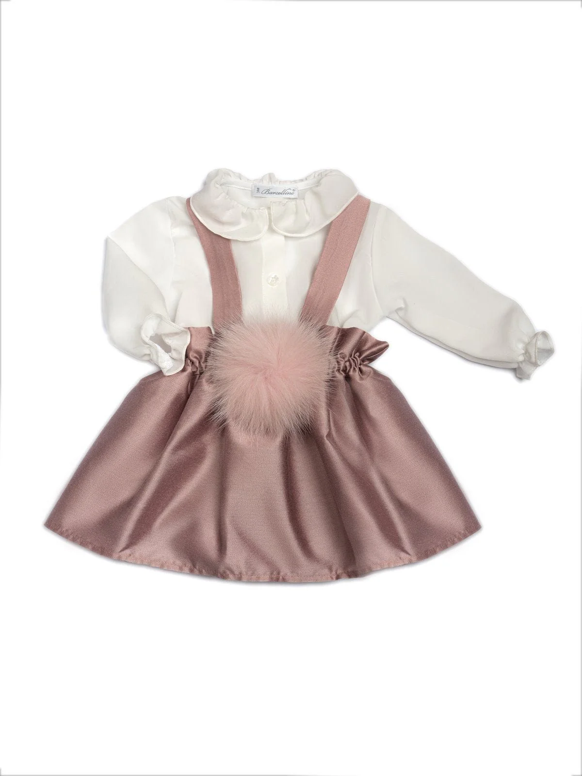 La gonna in duchesse, con la sua struttura rigida e sofisticata, è arricchita da bretelle regolabili e graziosi pompon che conferiscono un tocco giocoso e chic. Questo insieme combina eleganza e charme, creando un look perfetto per occasioni speciali.