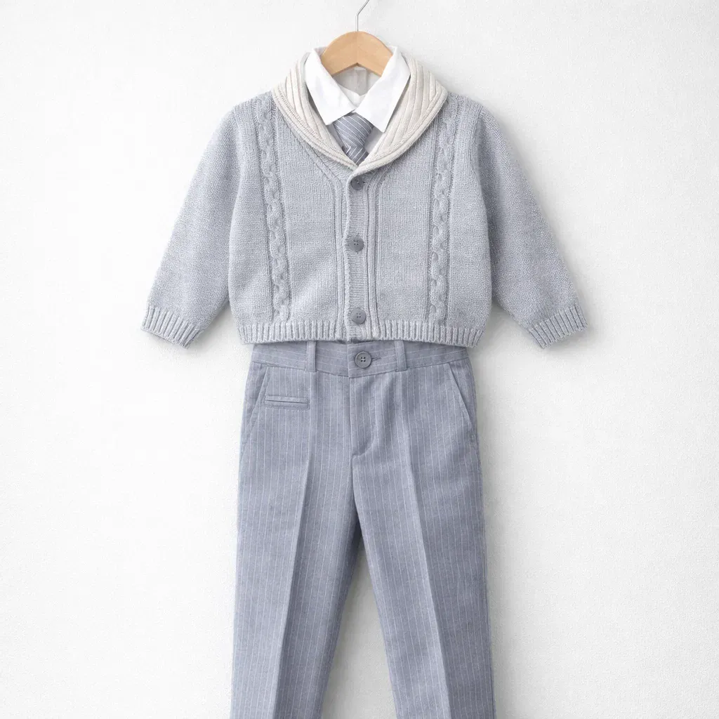 Completo da cerimonia per bambino dal gusto impeccabile e contemporaneo. Cardigan in maglia con lavorazioni a treccia e collo sciallato a contrasto, chiusura frontale con bottoni. Camicia bianca abbinata a cravatta tono su tono. Pantalone sartoriale gessato con tasche a filetto e chiusura con bottone. Un insieme raffinato, pensato per occasioni speciali come battesimi e cerimonie, dove ogni dettaglio fa la differenza.