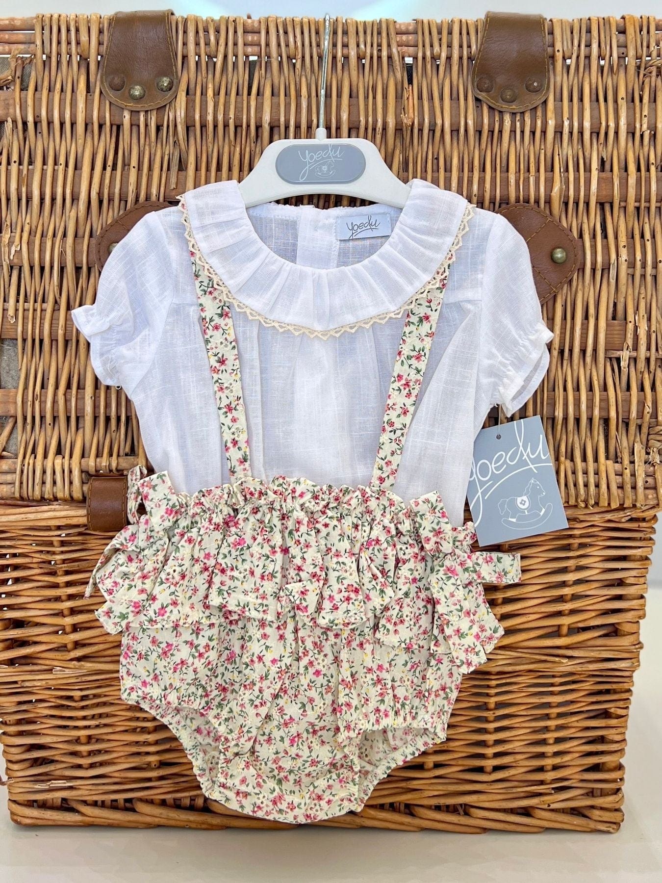 Pagliaccetto neonata in cotone con fantasia floreale, abbinato ad una camicia in cotone mezza manica arricciata e collo con volant.