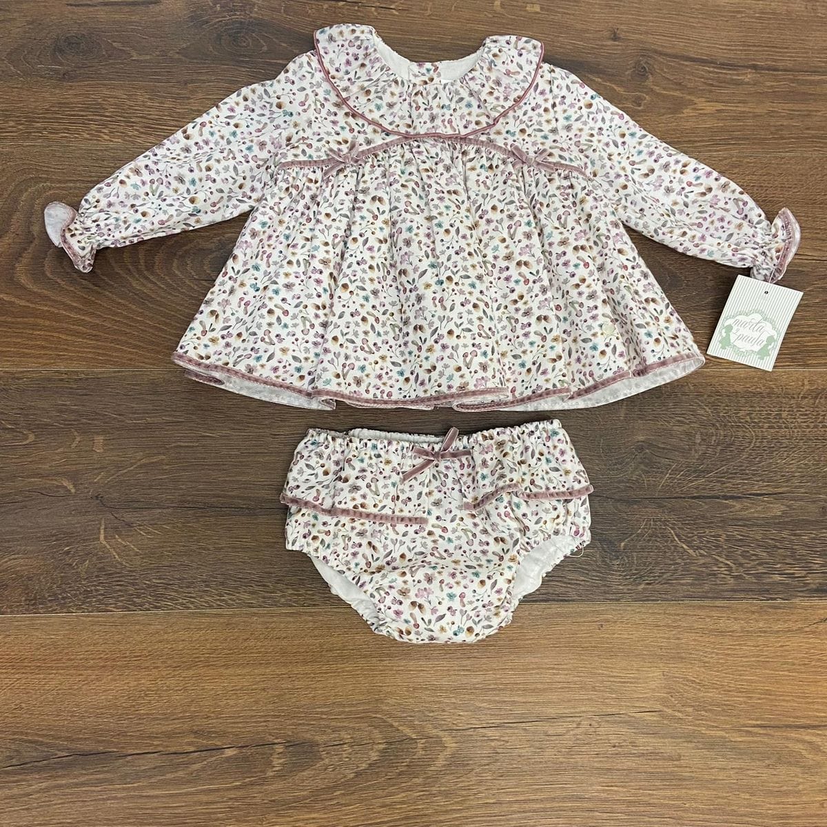 Completo due pezzi con vestitino a fantasia floreale con colletto e polsini con rouches e culotte.