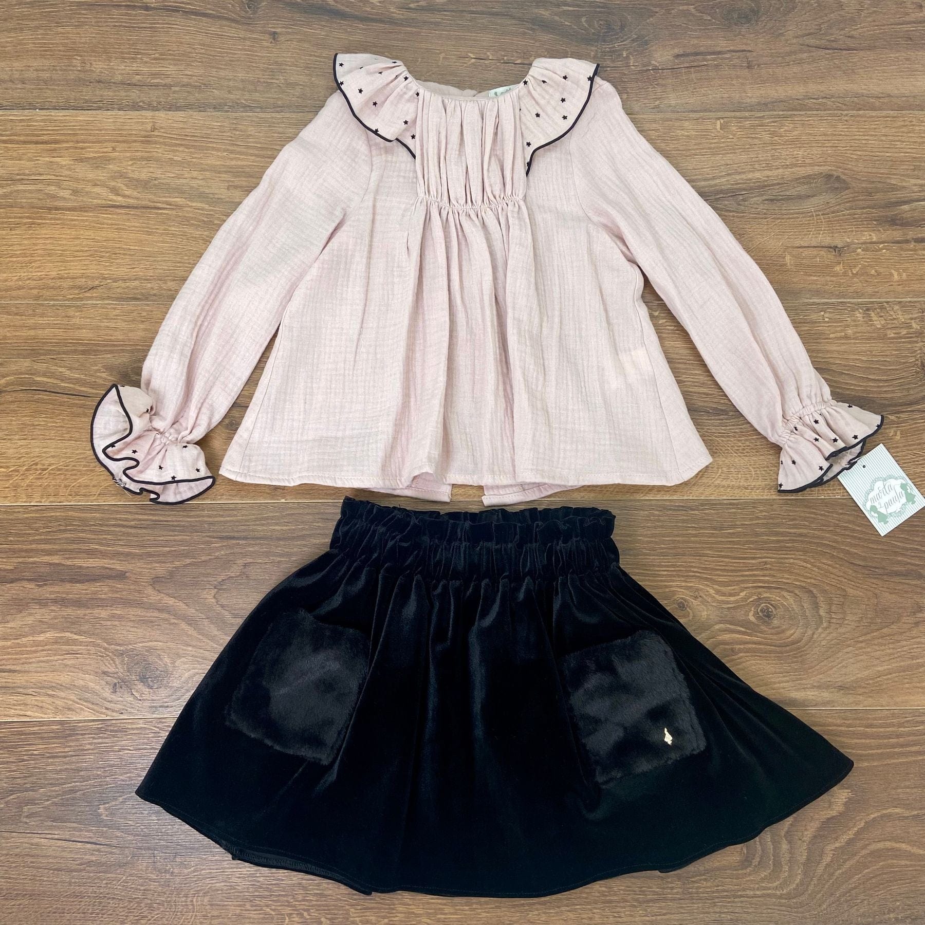 Completo con camicetta e gonnellina con tasche in pelliccia.