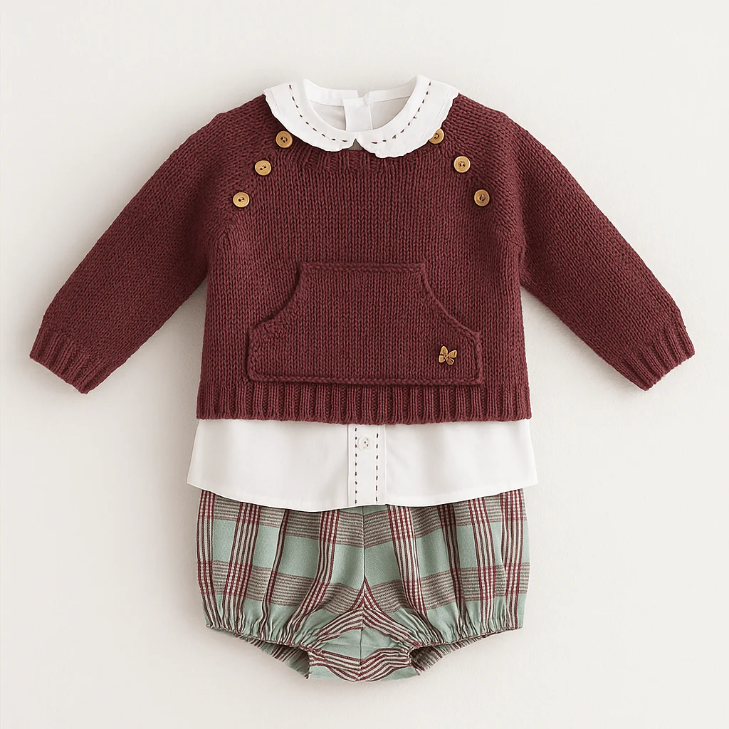 Completo tre pezzi con camicia con colletto alla coreana,maglioncino con aperture laterali e pantaloncino a fantasia.