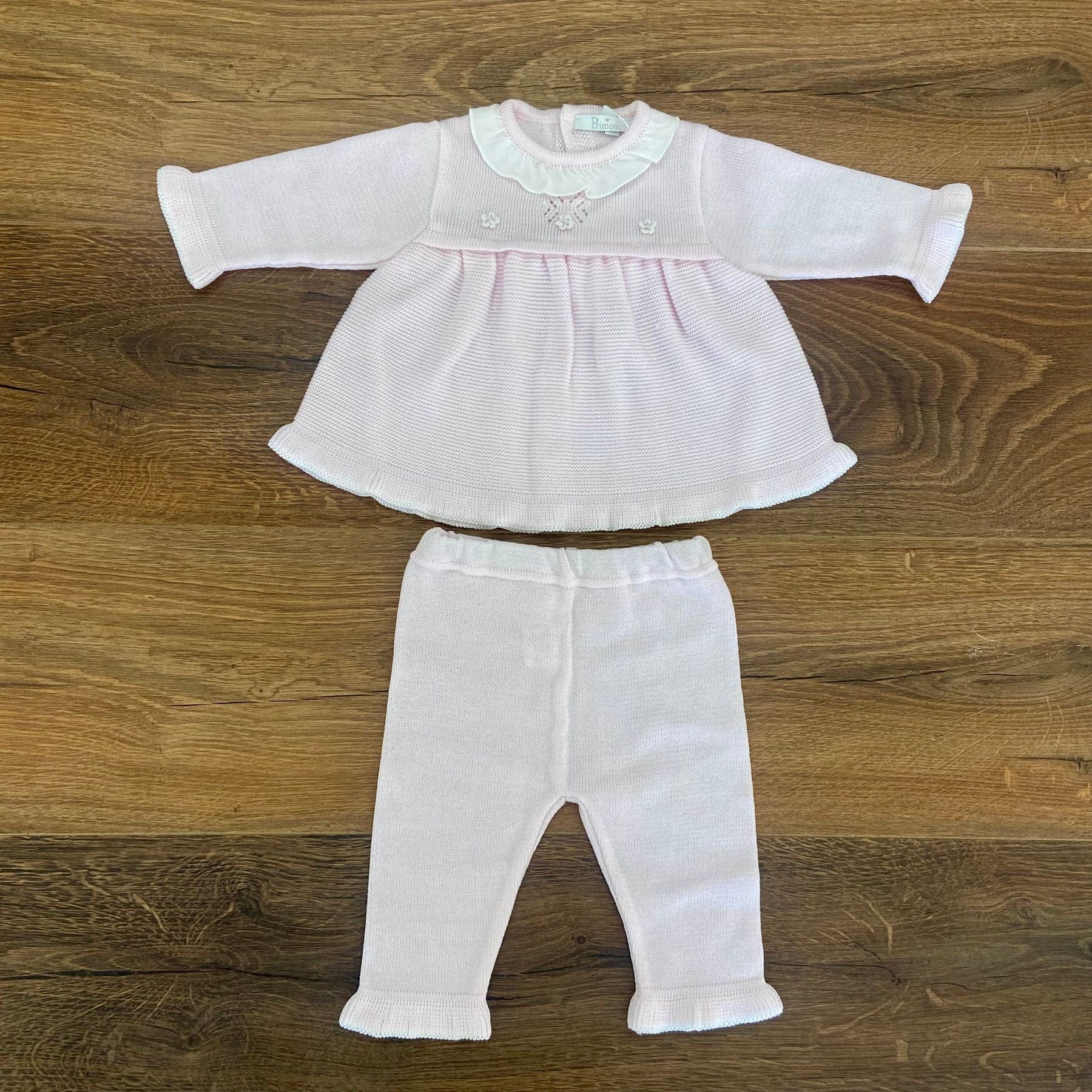 Completo due pezzi con roselline a vapore e collo con rouches.