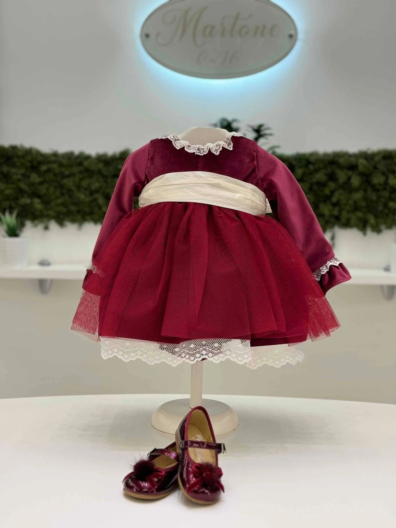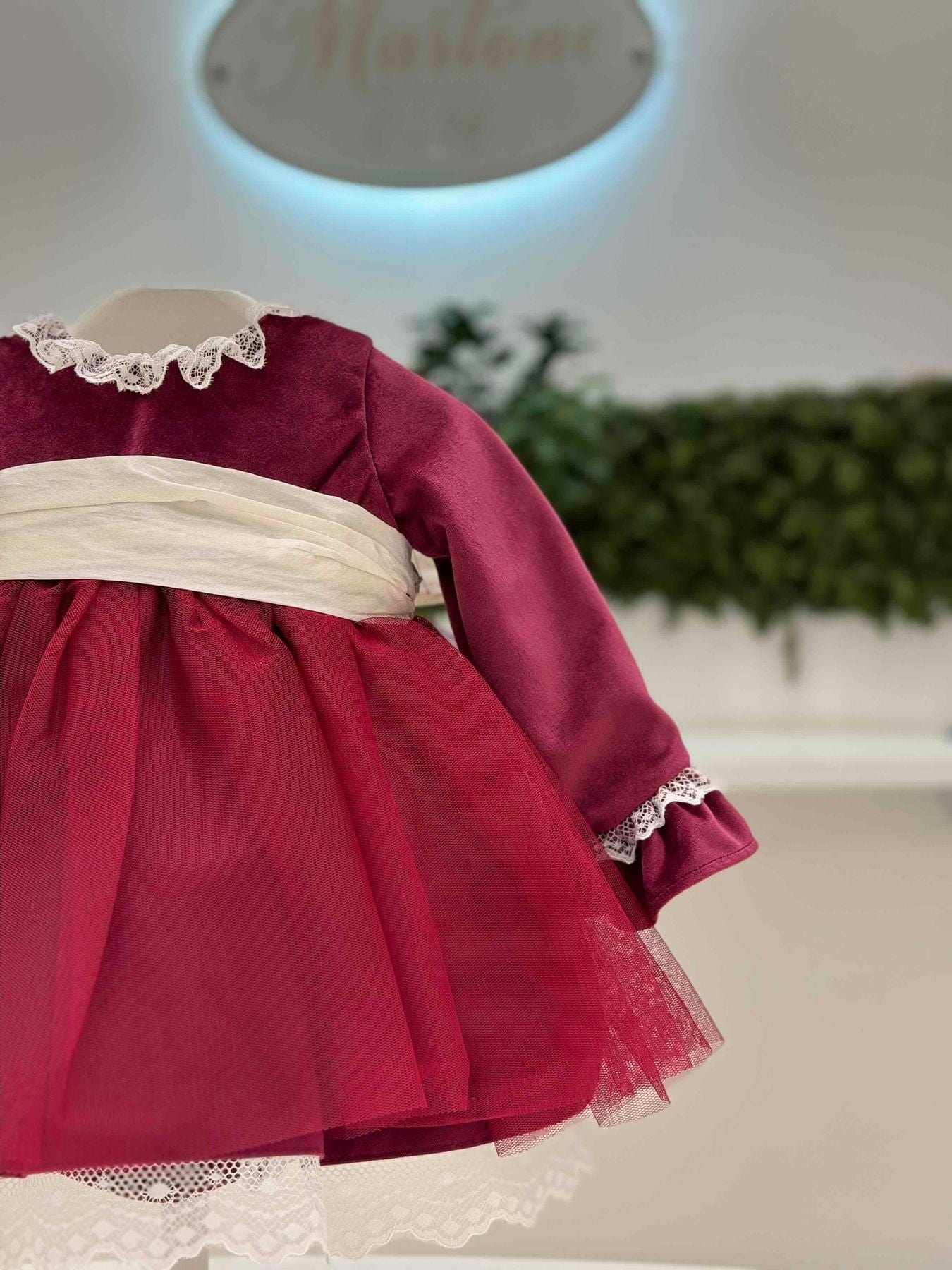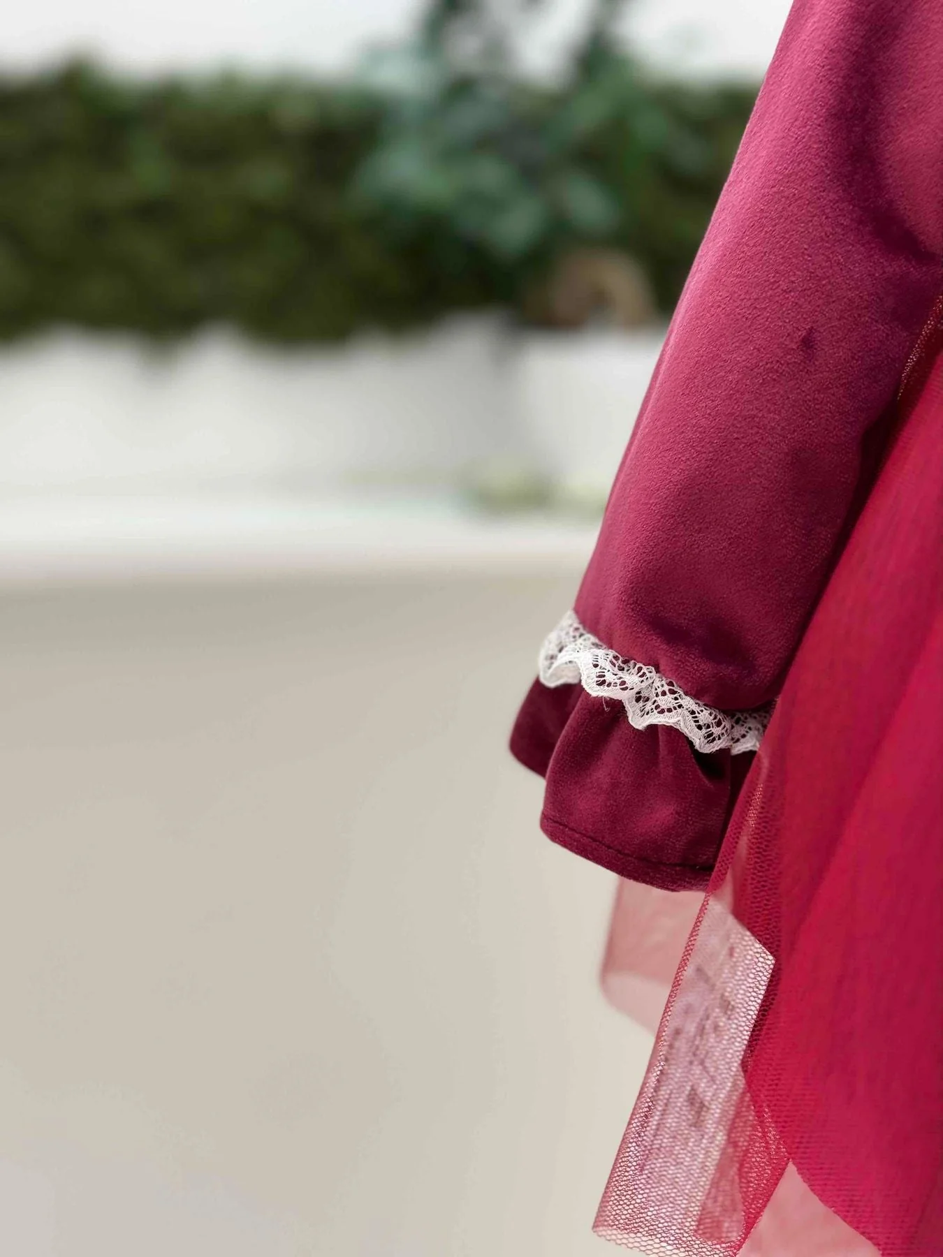 Abito corpetto di velluto, gonna di tulle con bordo di pizzo, manica lunga con pizzo al collo