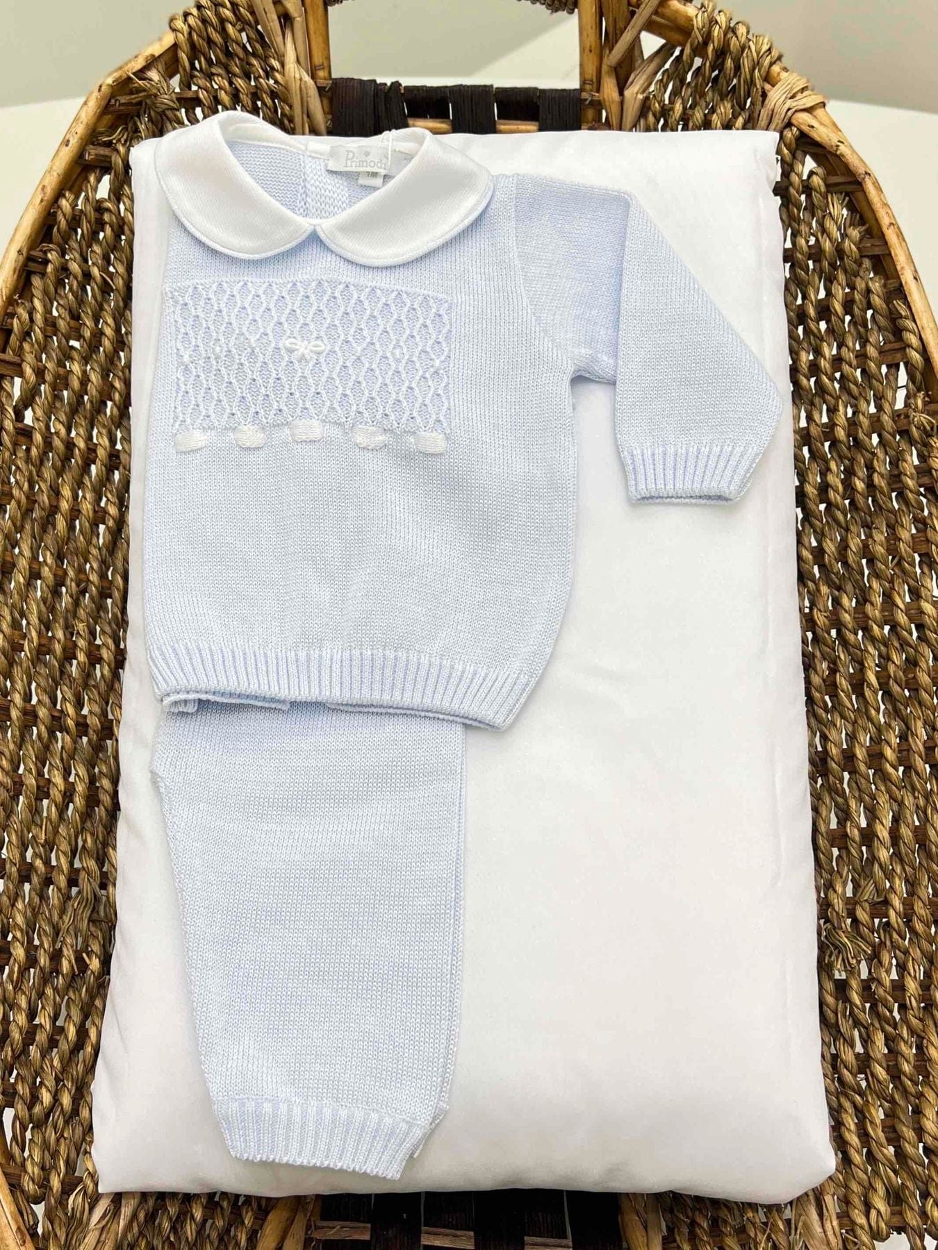 Completo nascita neonato due pezzi in filo di cotone.Maglia manica lunga con colletto in piqué, trama ricamata con rombi e fiocchetti e passanastro.100% cotone.