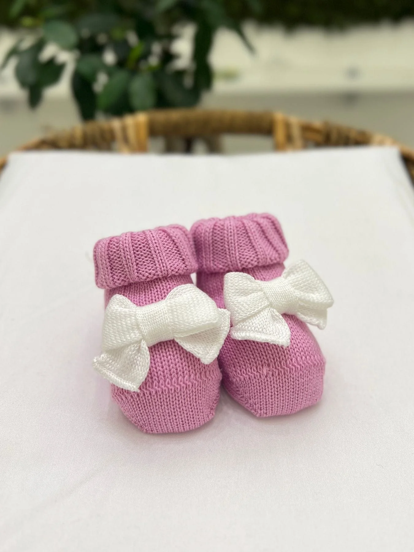 Scarpette da culla neonata in filo di cotone lavorato a mano con fiocco.