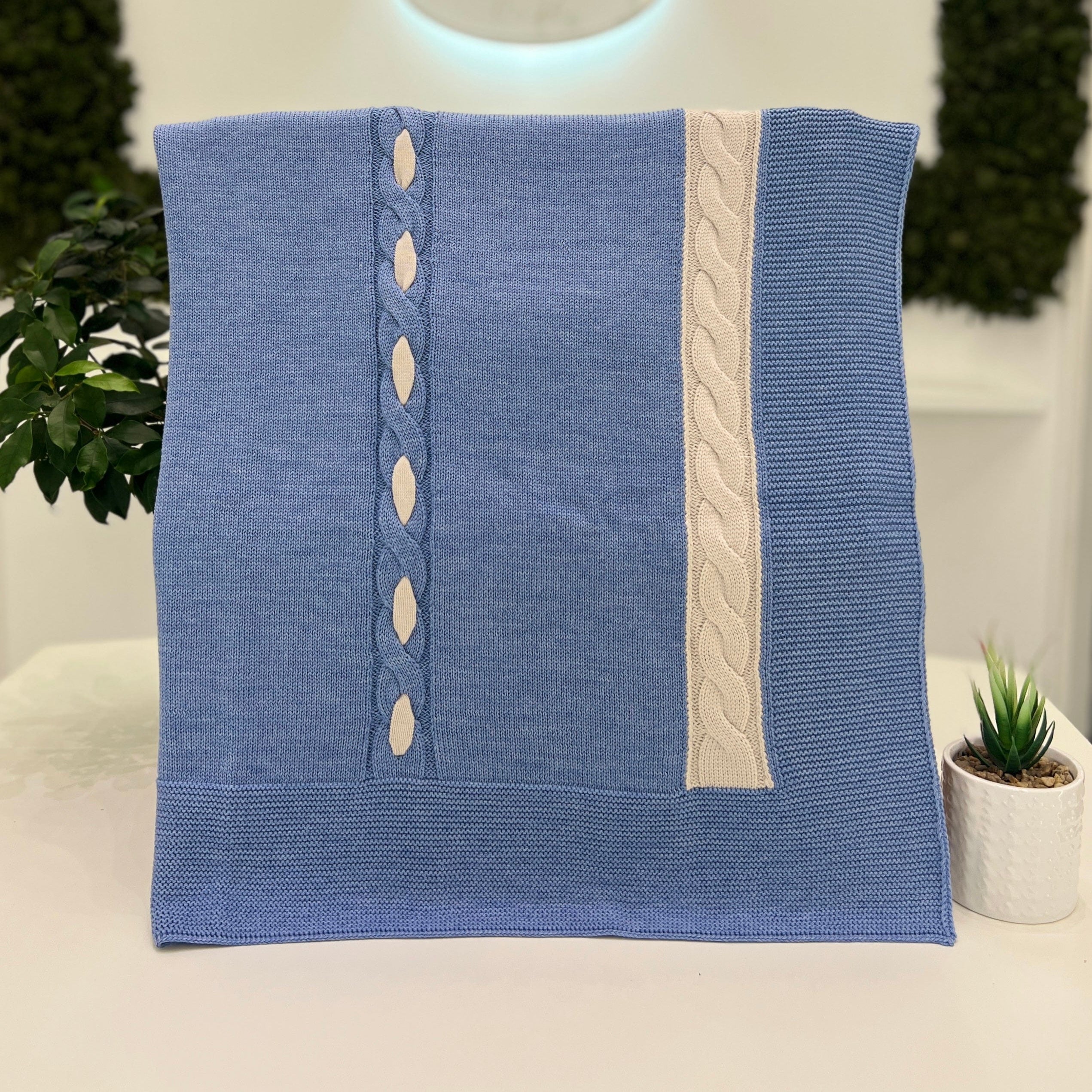 Una coperta in lana merino per neonato sfoderata, con lavorazione a trecce, è un accessorio elegante e funzionale. La sua lavorazione a trecce offre una texture ricca e accogliente, mentre i colori blu denim e tortora creano un contrasto raffinato e versatile. Realizzata in lana merino, la coperta è morbida, calda e traspirante, ideale per avvolgere il neonato con comfort e stile. La scelta di colori neutri e sofisticati la rende adatta a vari ambienti e facilmente abbinabile.