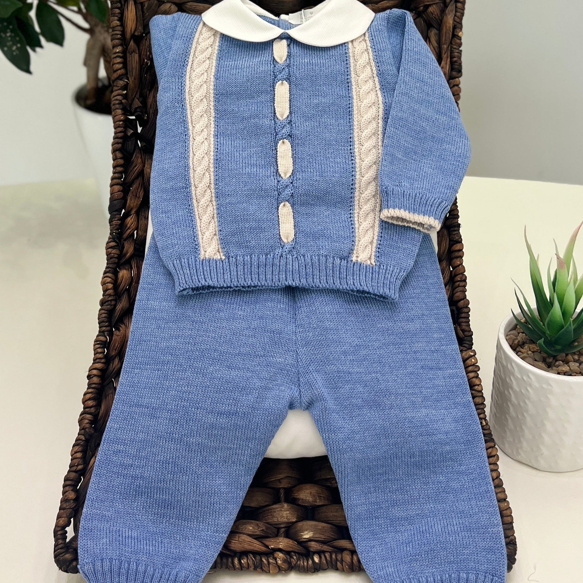 Una tutina due pezzi per neonato in lana merino composta da maglioncino con lavorazione a trecce e pantalone coordinato. I colori predominanti blu denim e tortora offrono un contrasto armonioso e moderno. Il colletto rotondo del maglioncino dona un aspetto dolce e classico, completando il design con un tocco delicato. Realizzata in lana merino, la tutina è morbida, calda e traspirante, perfetta per mantenere il neonato comodo e al caldo.