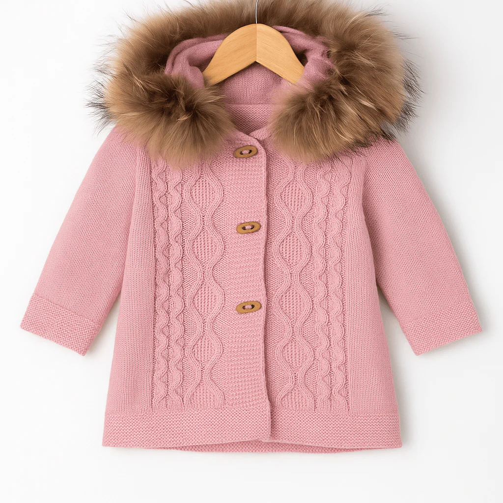 Cappottino rosa in maglia con cappuccio rifinito da un morbido bordo in pelliccia ecologica, pensato per un look caldo e raffinato. Il davanti è caratterizzato da un ricco motivo intrecciato che dona struttura ed eleganza, mentre i bottoni effetto legno aggiungono un tocco naturale e delicato. Un capo avvolgente e sofisticato, ideale per accompagnare la stagione fredda con stile.