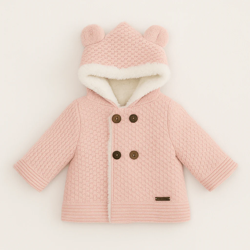 Cappottino in maglia rosa con lavorazione a nido d’ape, cappuccio con orecchiette e interno in morbida pelliccetta. Chiusura doppiopetto con bottoni e bordo lavorato a coste per una finitura curata.