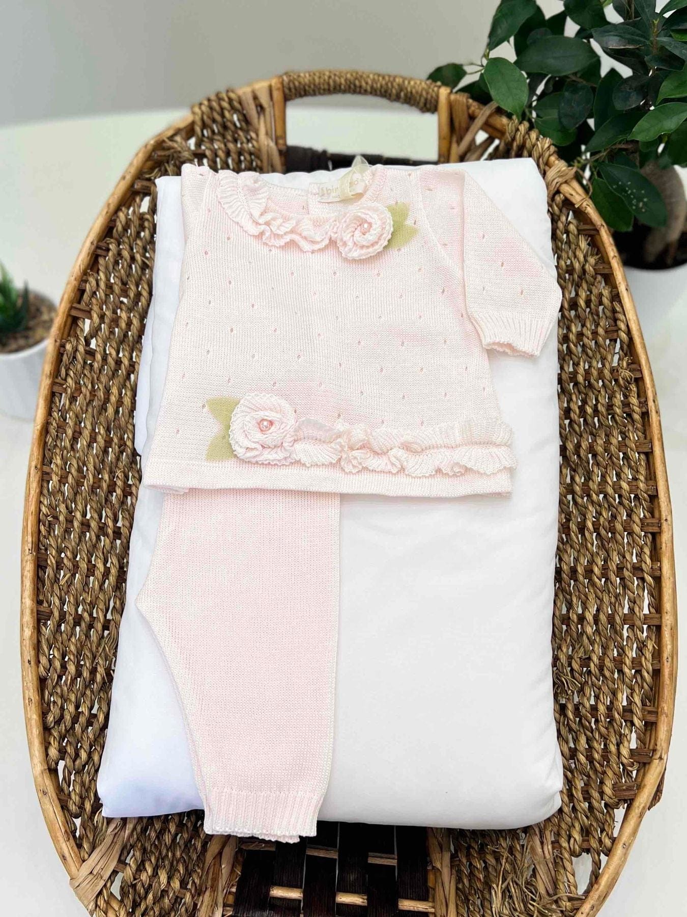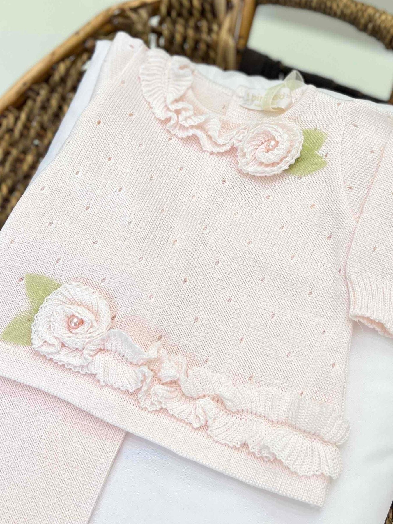Completo clinico neonata due pezzi in filo di cotone con lavorazione traforata, colletto arricciato ed applicazioni floreali in filo di cotone.