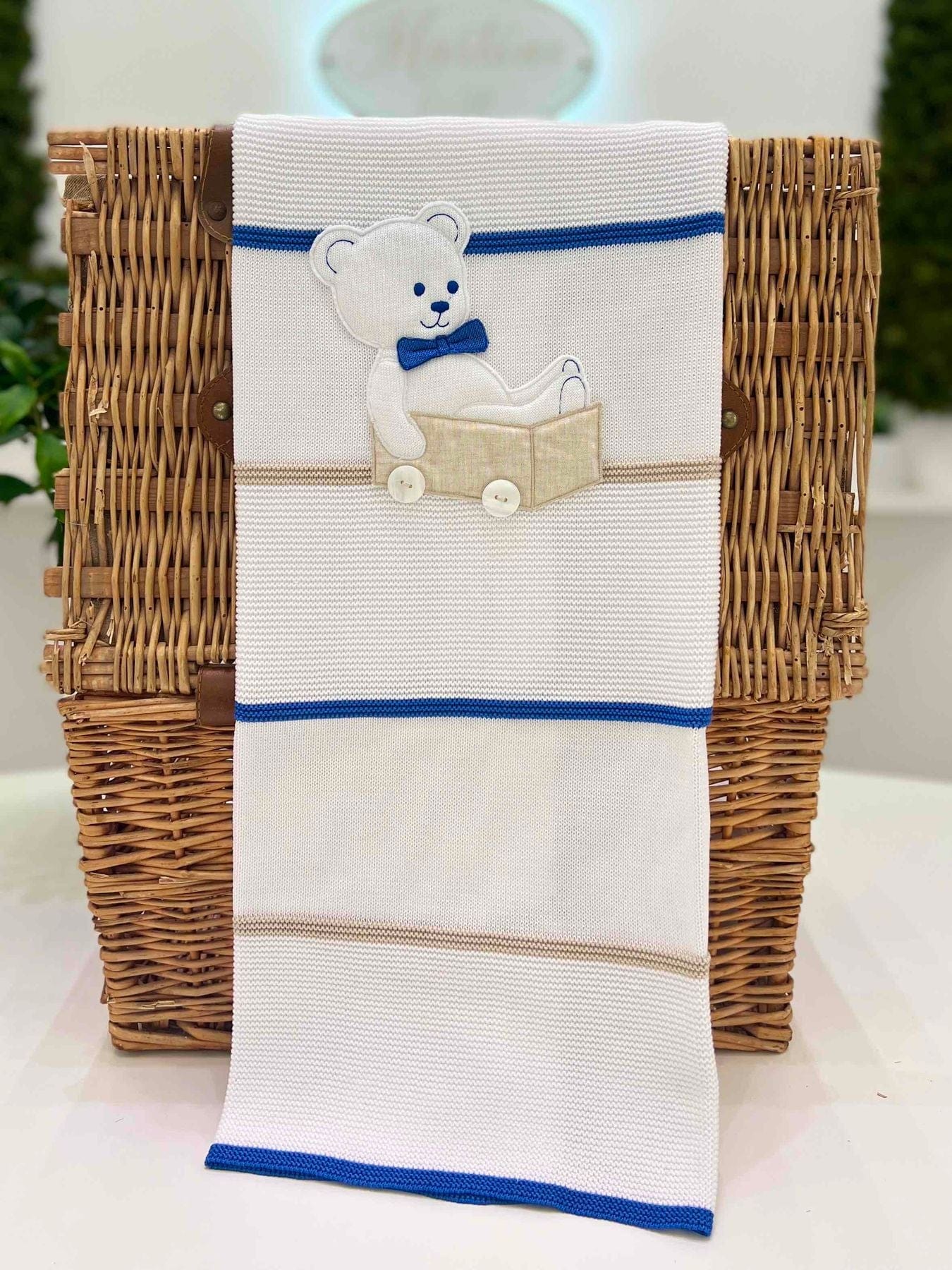Copertina neonato in filo di cotone lavorato con applicazione orsetto.