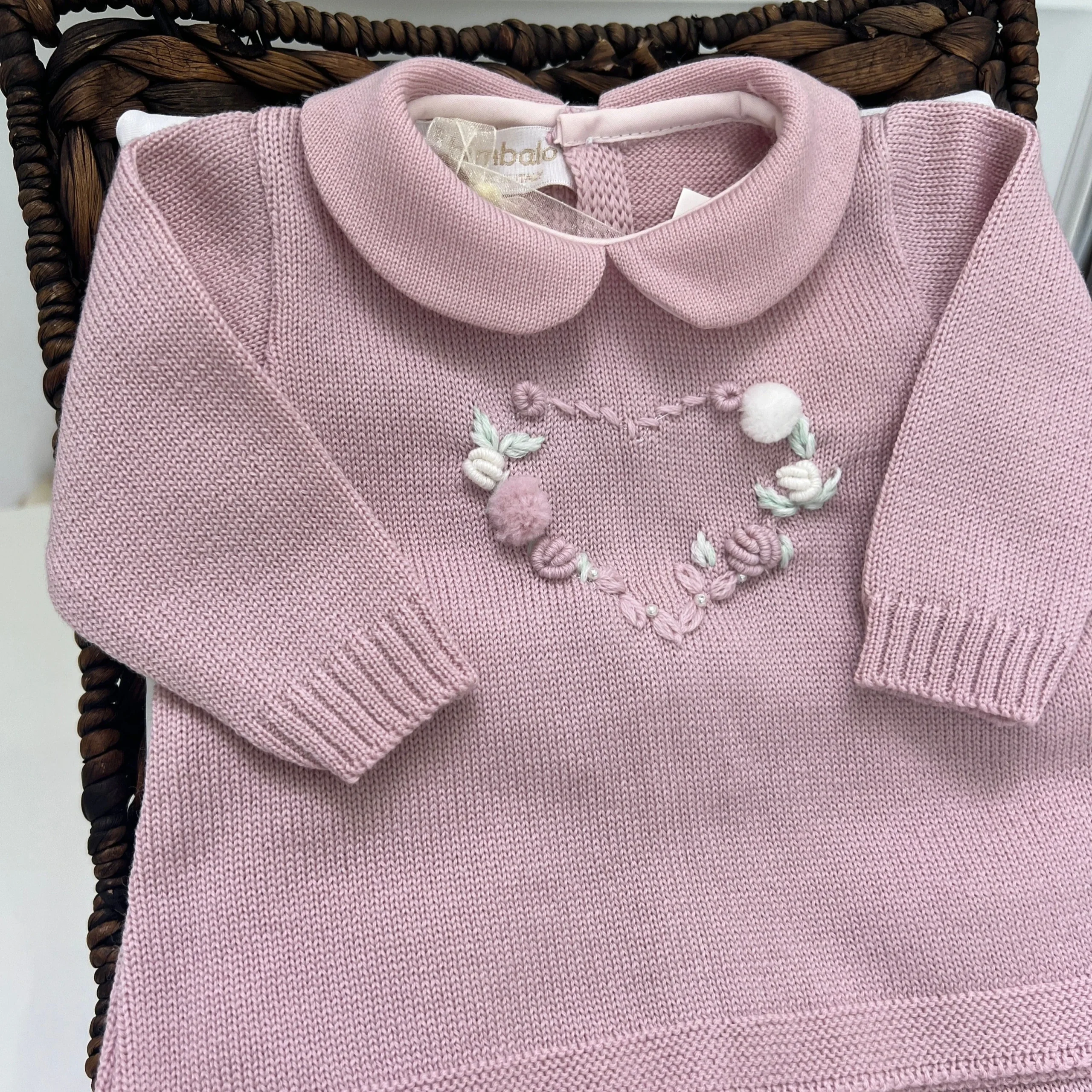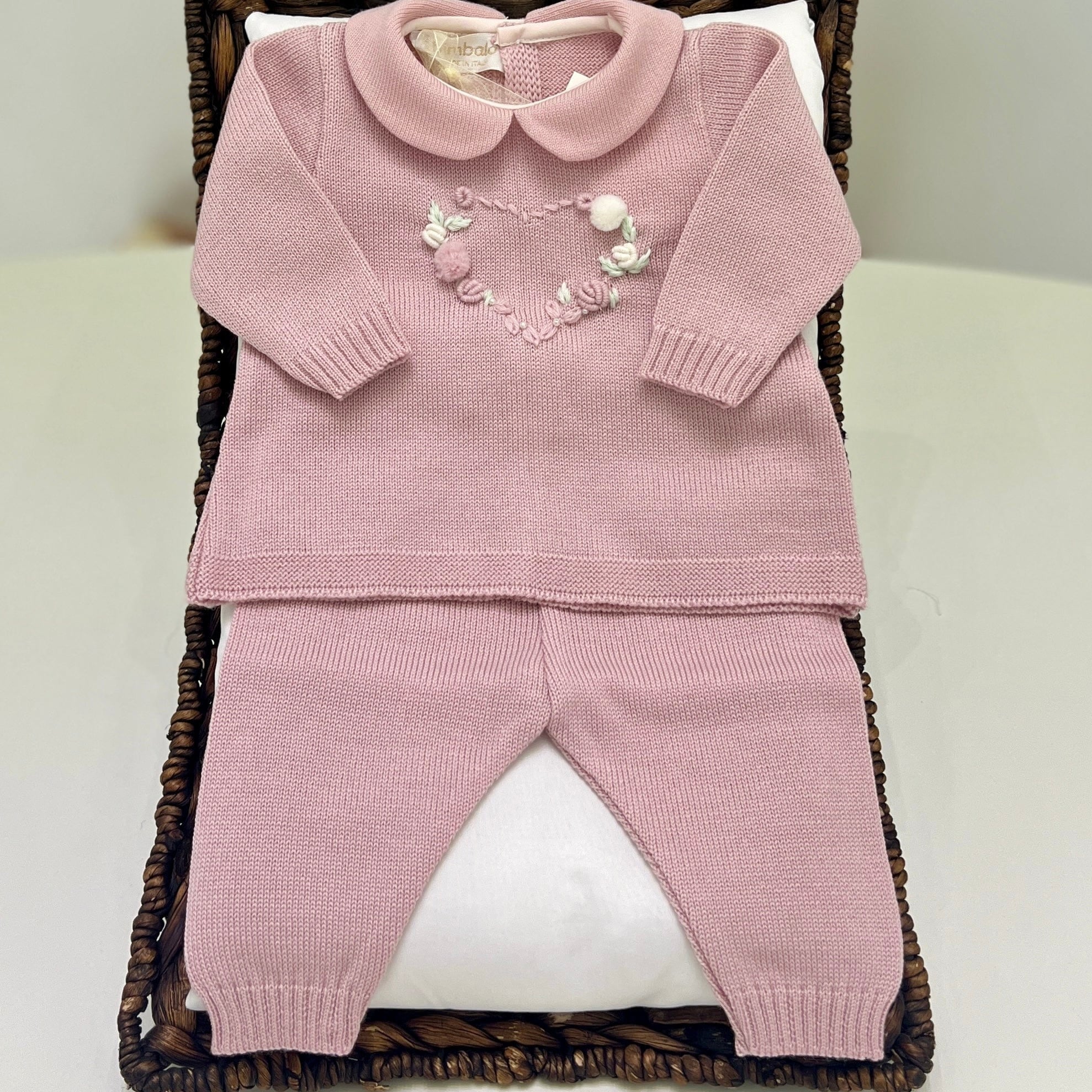 Una tutina spezzata per neonata in un delicato colore rosa, composta da una maglia con colletto rotondo e morbidi pantaloni coordinati. La maglia ha bottoni sul retro per una vestizione facile. Sul davanti, spicca un ricamo di un cuore adornato con fiorellini realizzati in punto a vapore, completato da piccoli pompon che aggiungono un tocco giocoso e dolce.