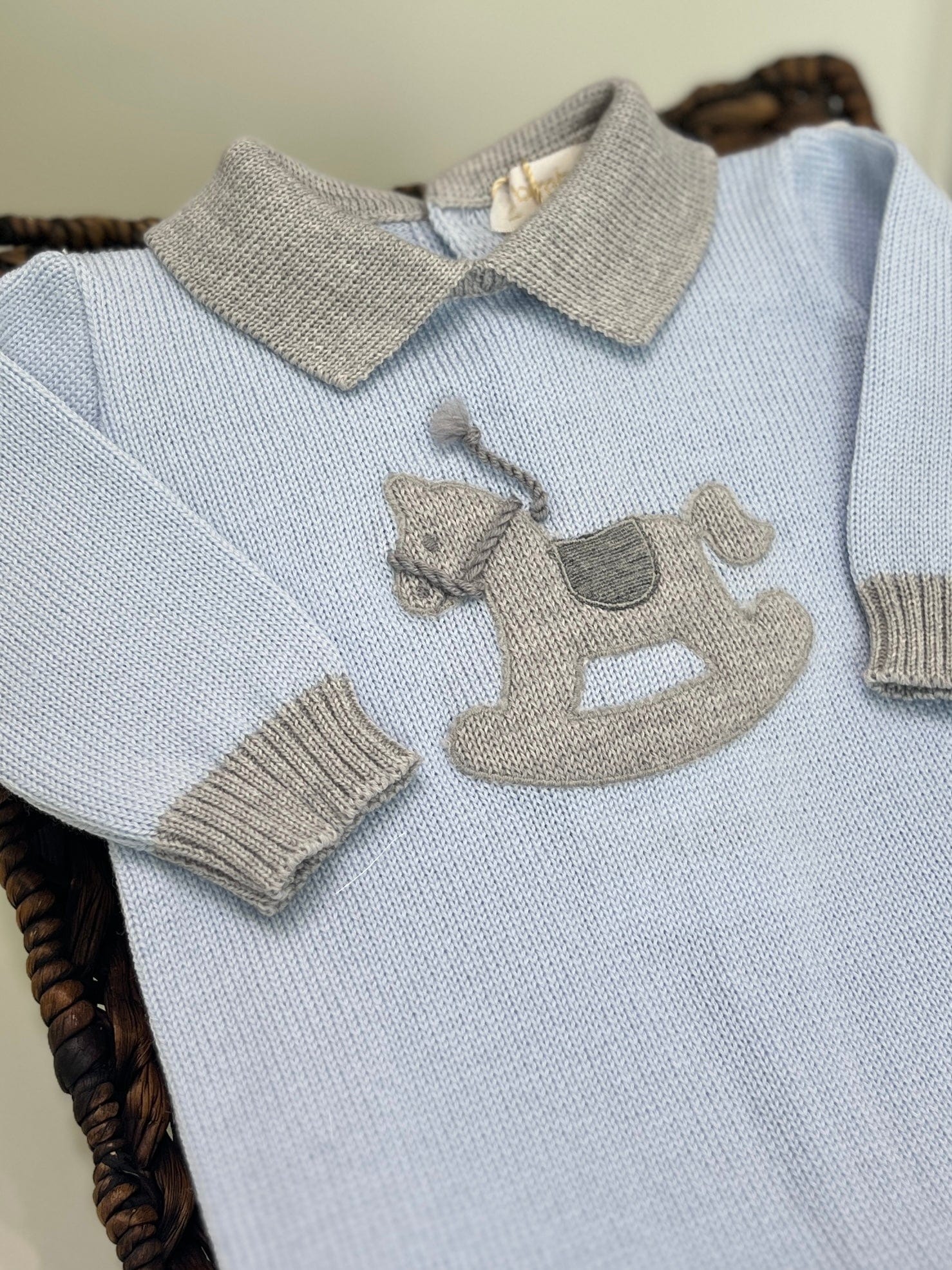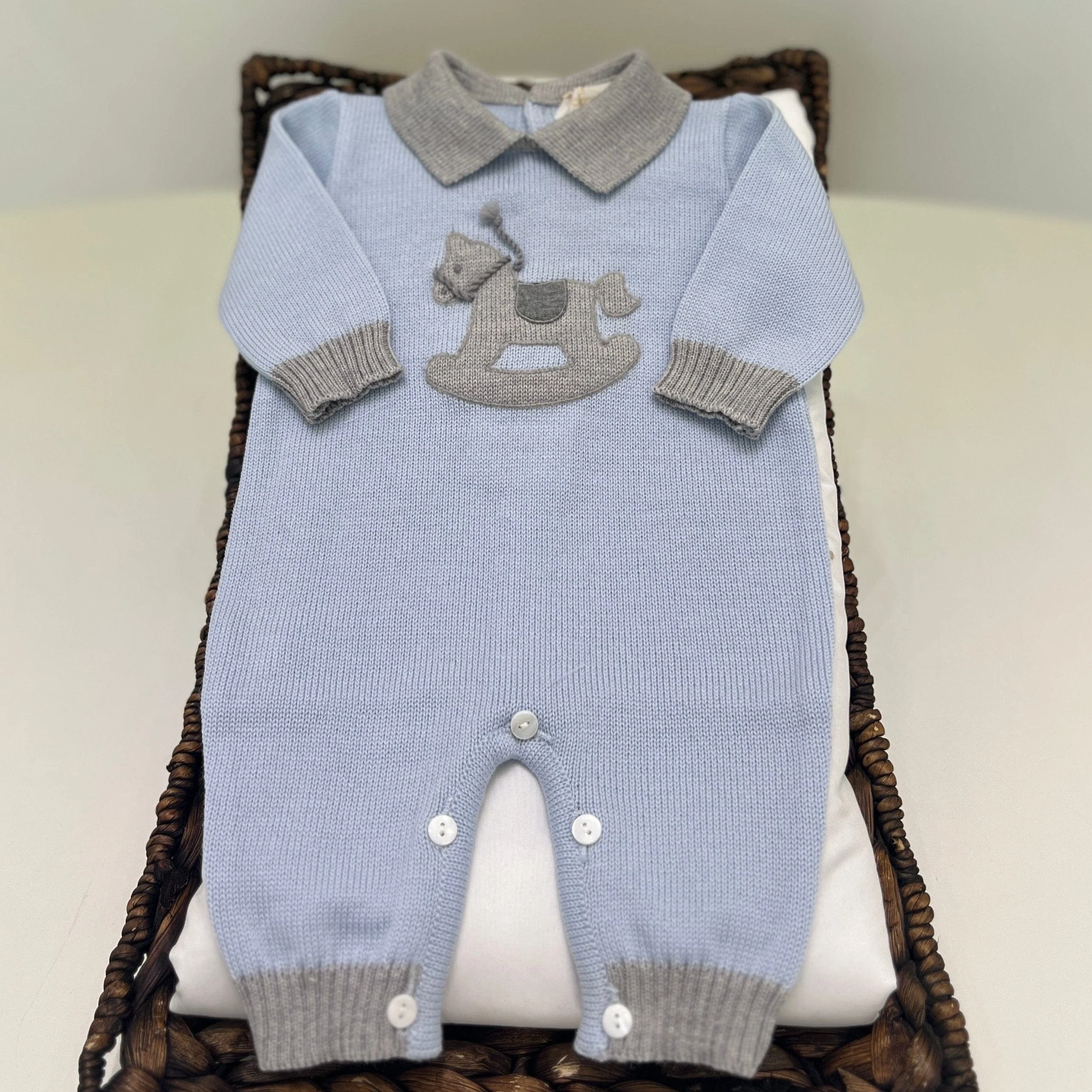Una tutina intera per neonato in lana color celeste cielo, con bordi di un delicato grigio. Sul petto è ricamato un cavallo a dondolo. I bottoni, color tortora, si trovano sul retro e sul cavallo per facilitare vestizione e cambio.