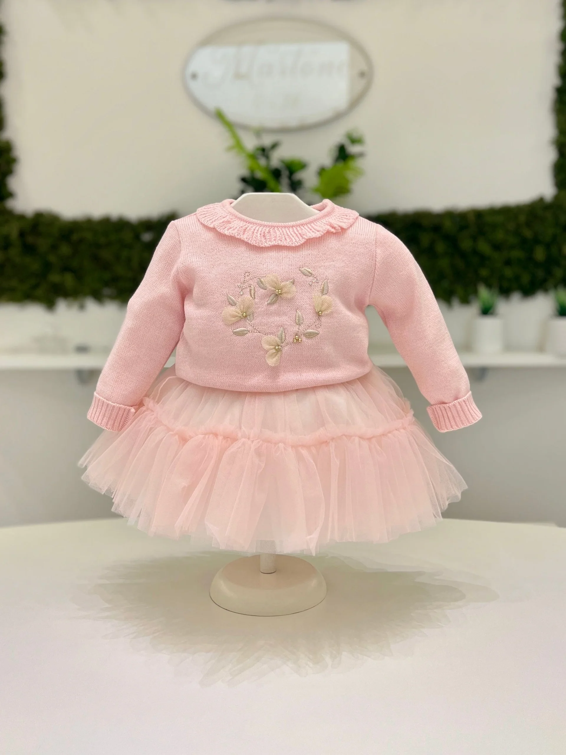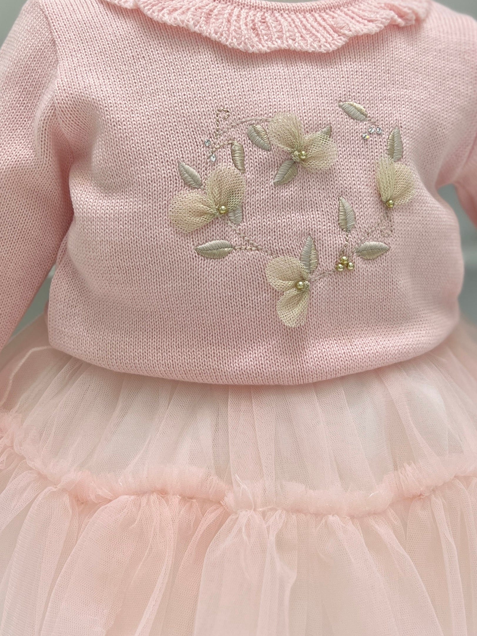 Un delizioso completo per bimba composto da un maglione rosa in lana, con rouches delicate sul colletto e decorazioni beige che aggiungono un tocco elegante. La gonna in tulle a balze, leggera e vaporosa, completa l’outfit con uno stile femminile e giocoso, perfetto per un look dolce e raffinato.