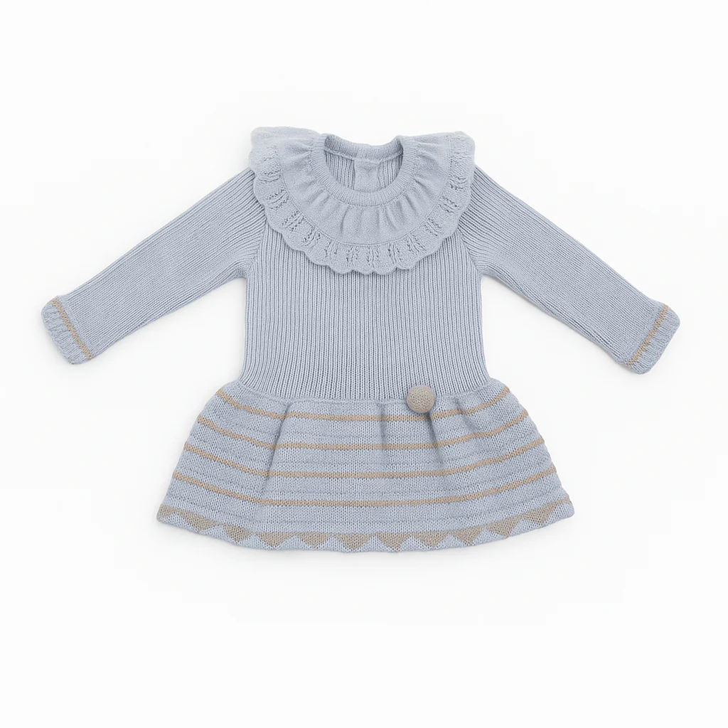 Abitino in maglia con lavorazione verticale sul corpetto e ampia balza a righe tono su tono. Colletto a volant lavorato e dettaglio applicato in vita, per un insieme raffinato e armonioso.