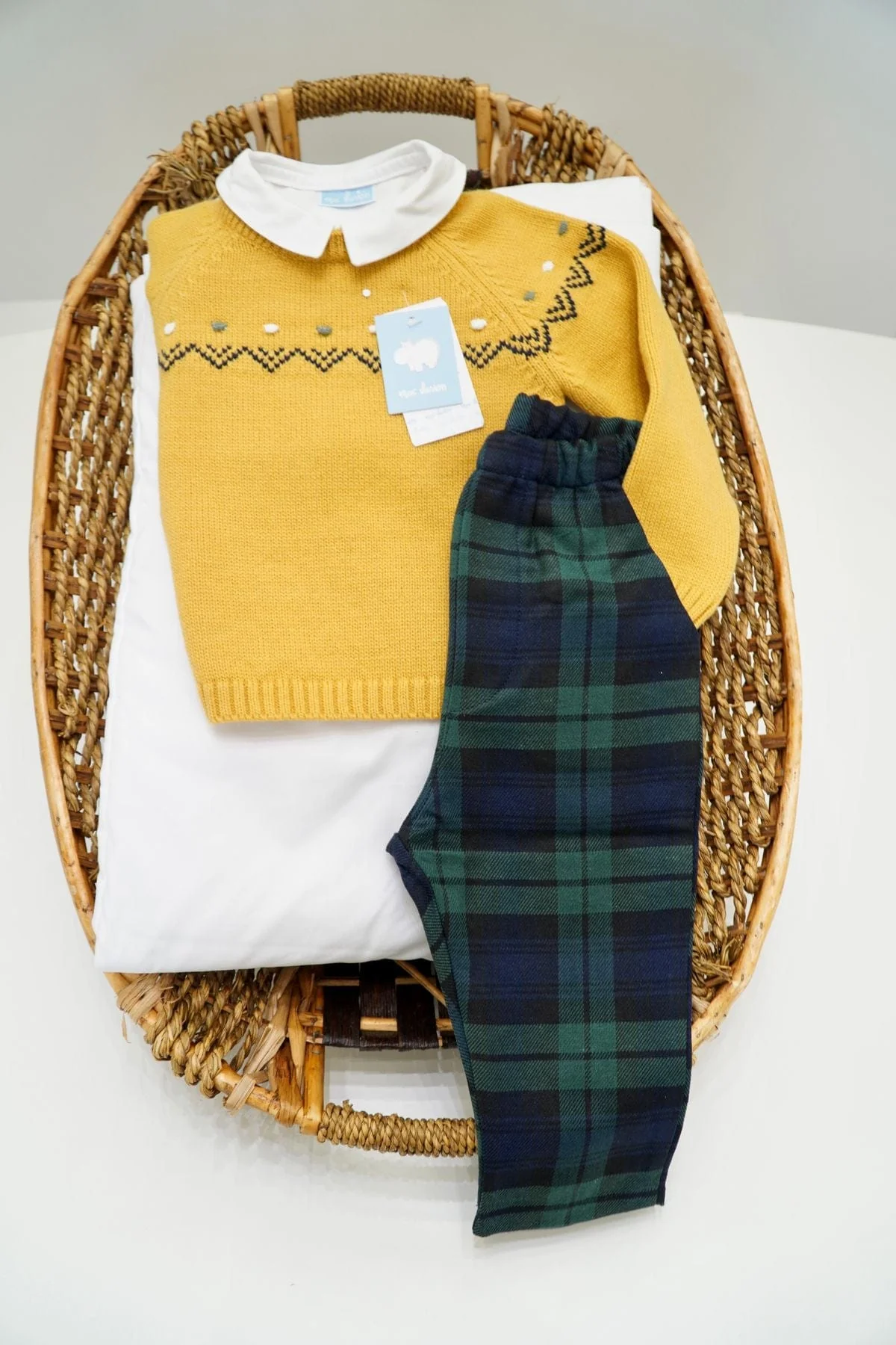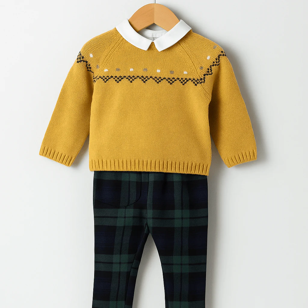 Completo bimbo con maglioncino col.mostaza e pantalone a quadri