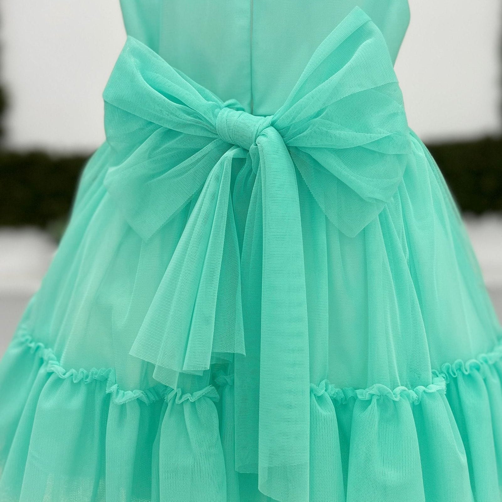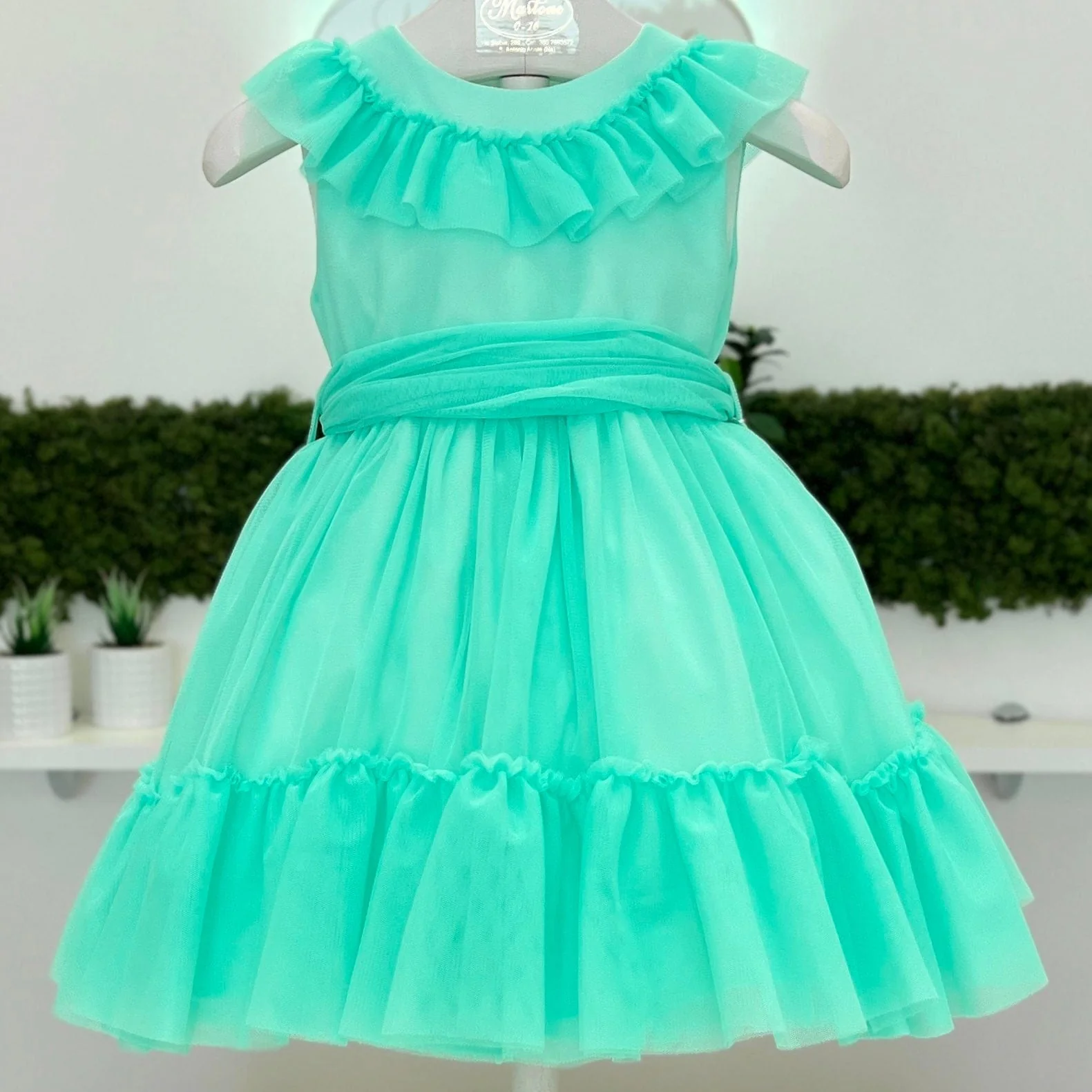 Abito baby in tulle a balze con volant e fiocco sul retro.