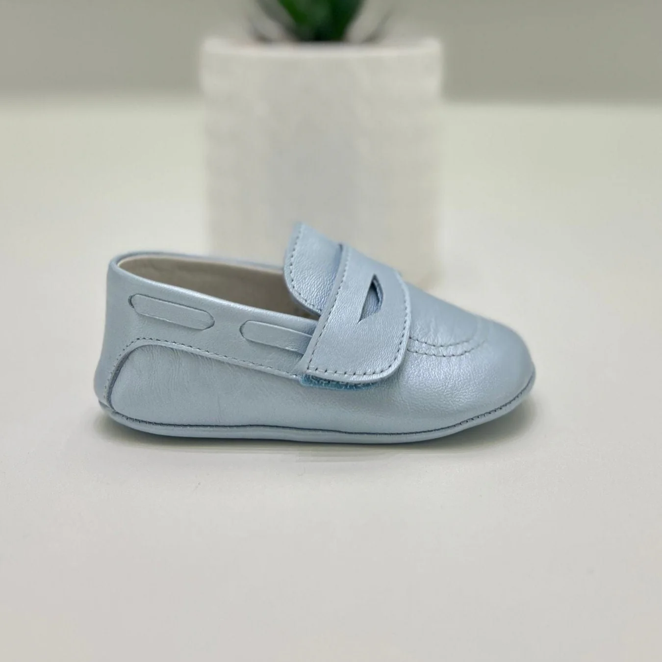Mocassino in pelle con velcro da culla color celeste perlato.