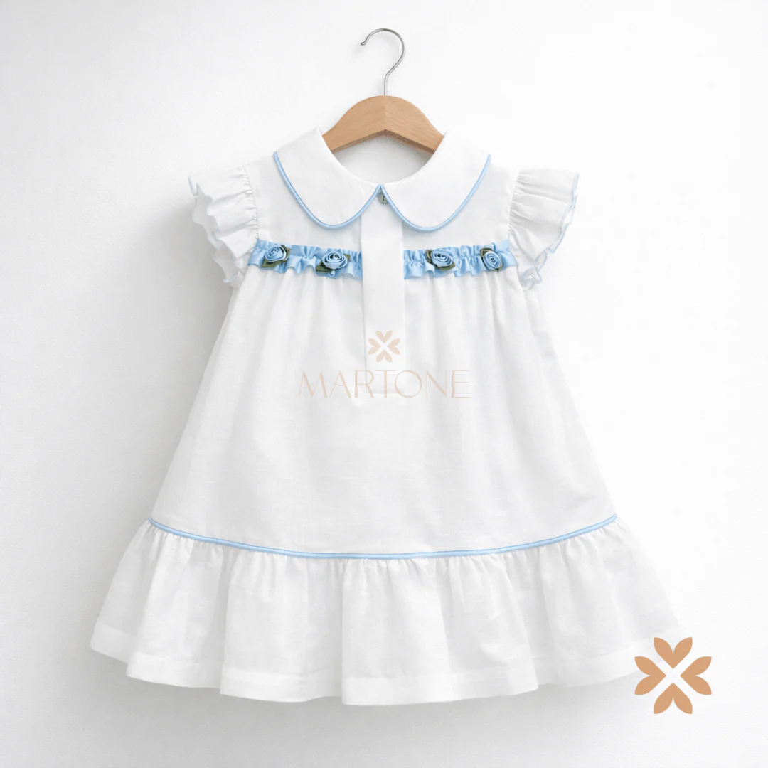 Abito da cerimonia in lino bianco con colletto tondo rifinito da profilo azzurro e maniche con ruches. Linea svasata con balza sul fondo e dettagli decorativi sul davanti con roselline applicate e inserti in contrasto. Vestibilità comoda e struttura leggera, ideale per occasioni speciali.
