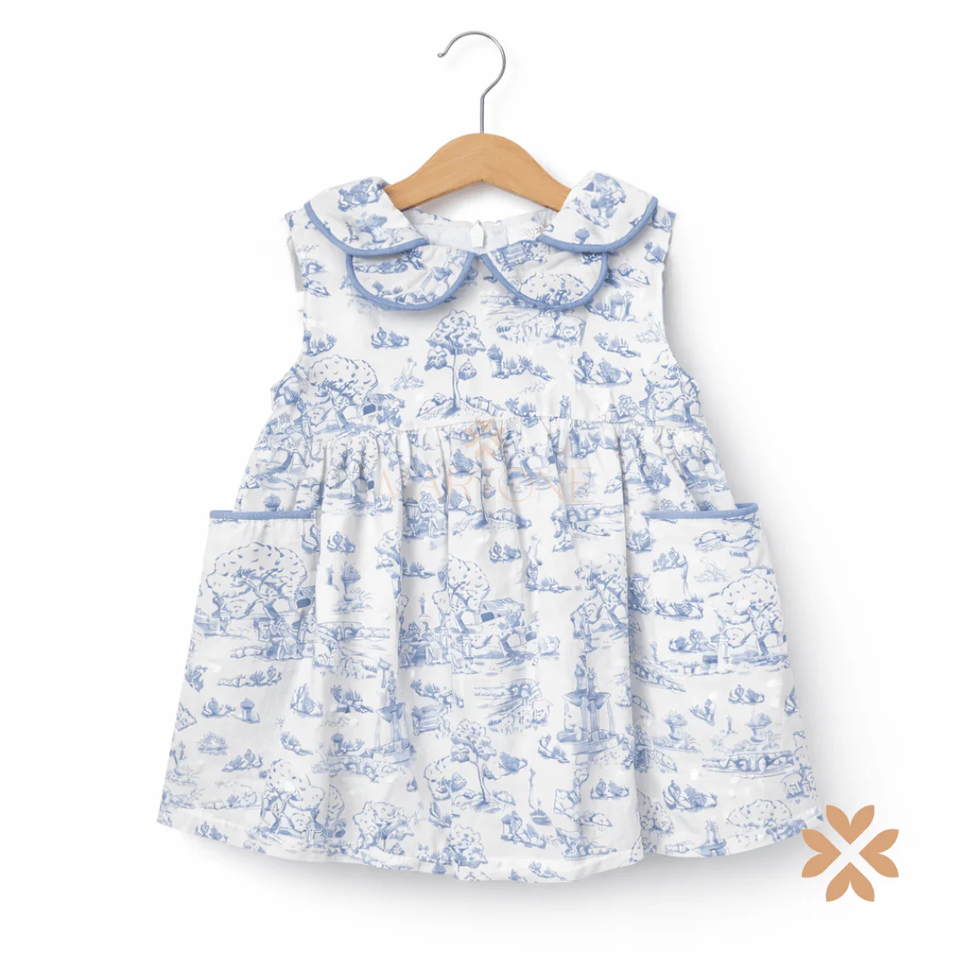 Abito per bimba con stampa decorativa toile de jouy, colletto sagomato e profili a contrasto. Gonna dalla linea morbida con tasche applicate. Chiusura posteriore. Design raffinato comp: 100% cotone