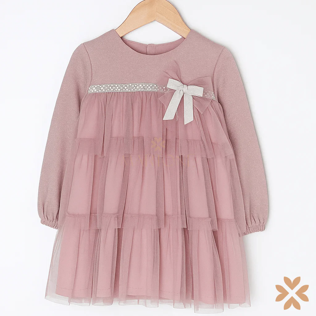 Abito per bambina in rosa con corpetto in lurex e gonna in tulle a balze, arricchito da applicazione di fiocco sul davanti e sul retro, ideale per cerimonie e occasioni speciali. comp: 5161INV-25