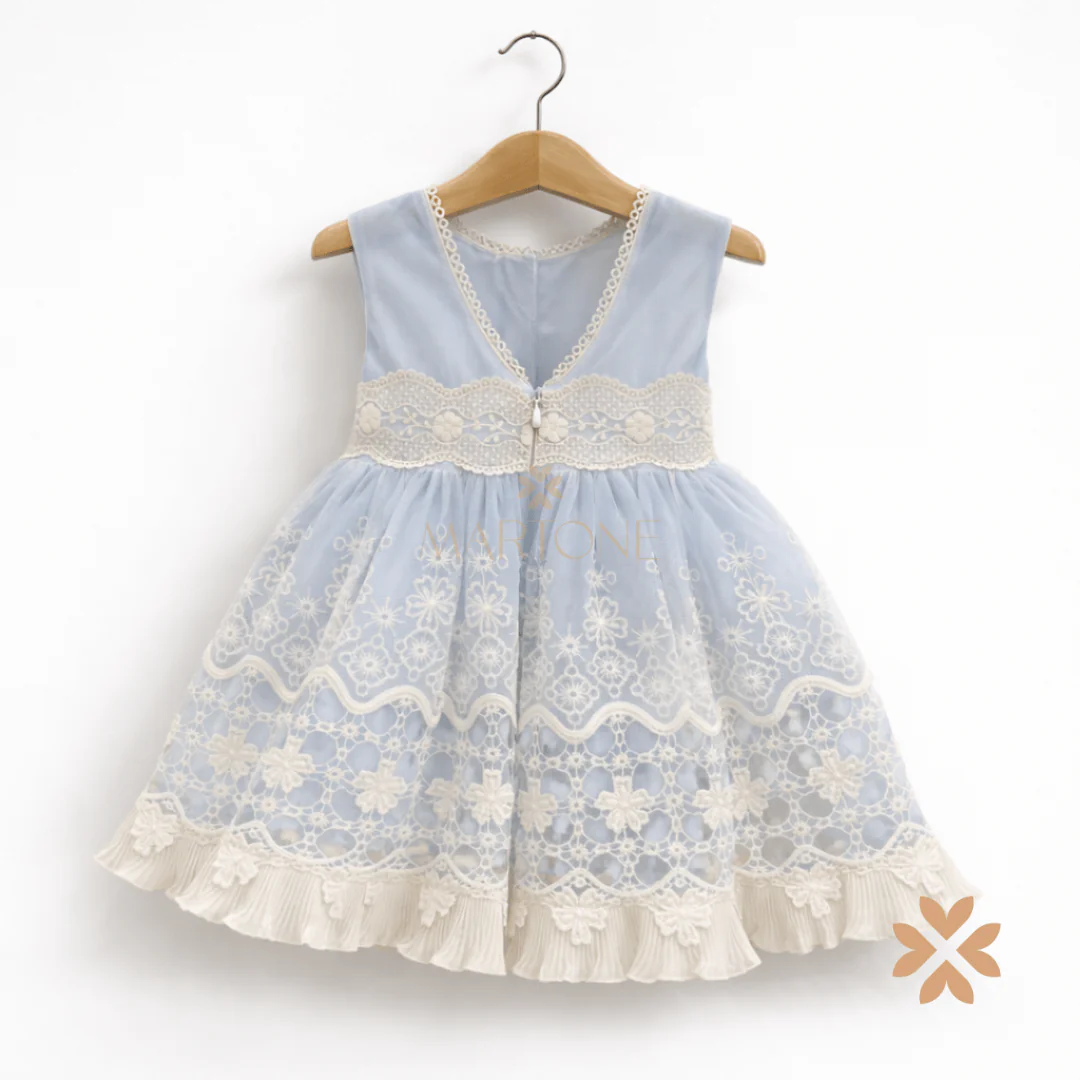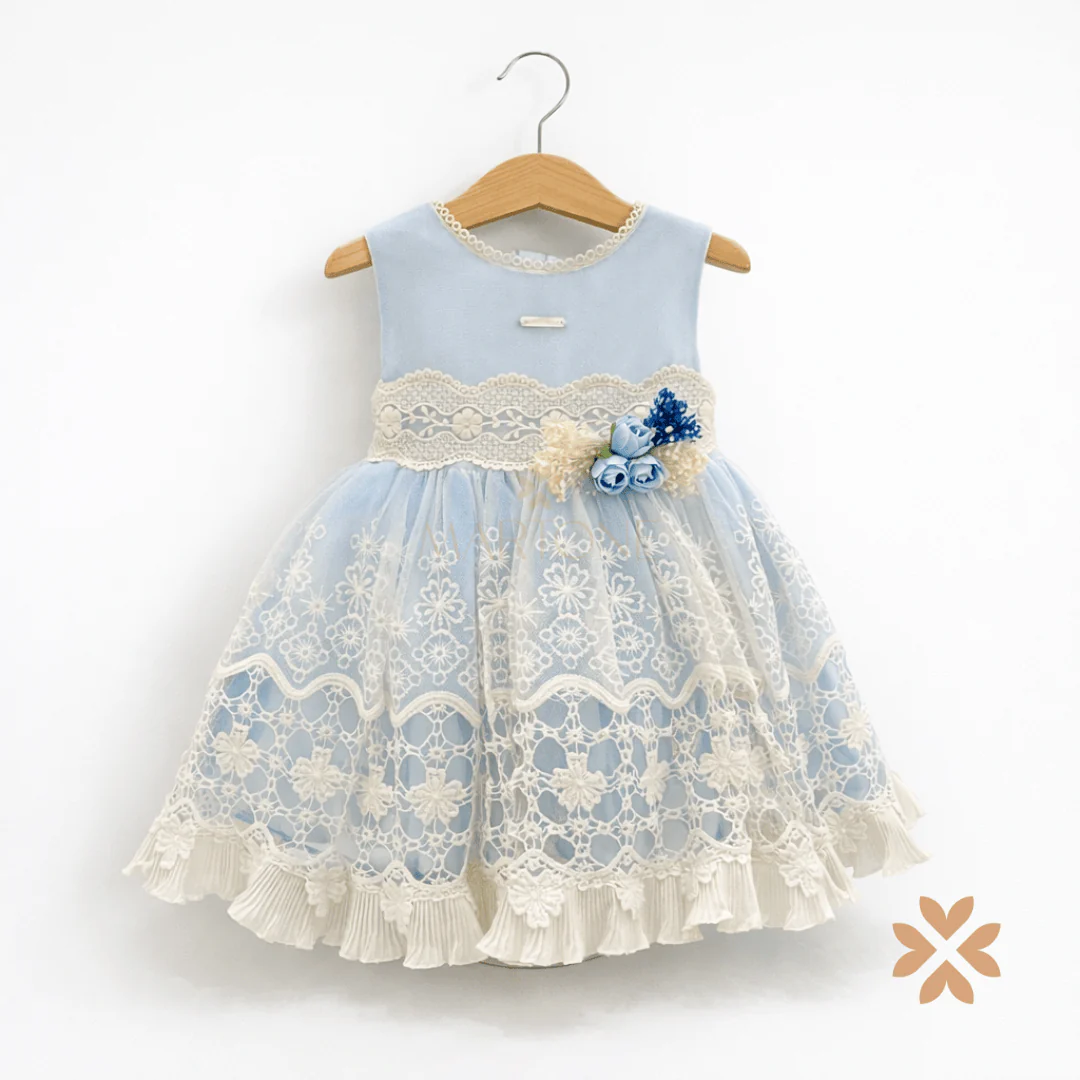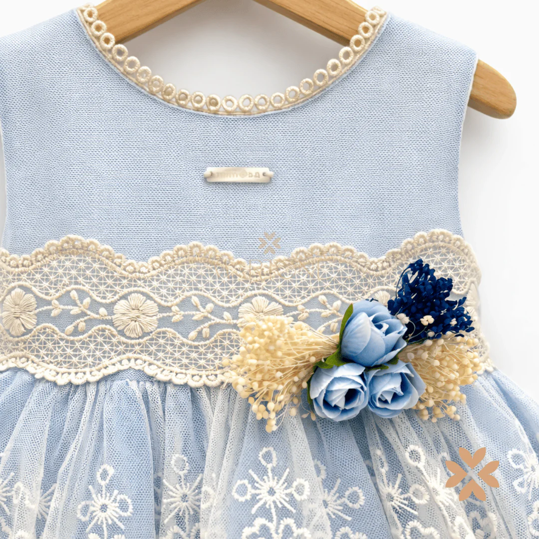 Abito bimba celeste con corpetto strutturato e gonna in tulle ricamato con applicazioni macramè/ricamo effetto pizzo. Fascia in vita ricamata con applicazione floreale, fondo con balze rifinite. Chiusura con zip.