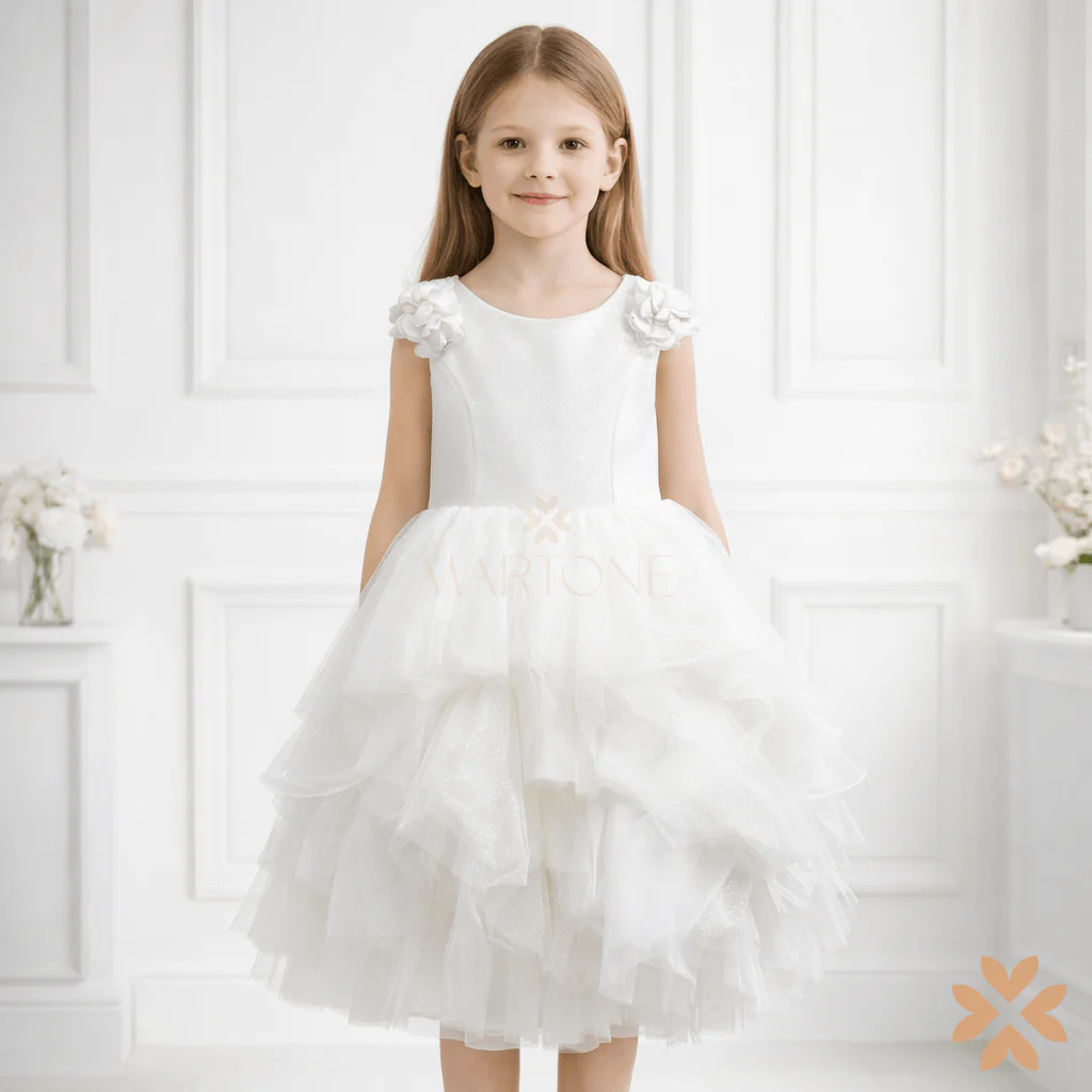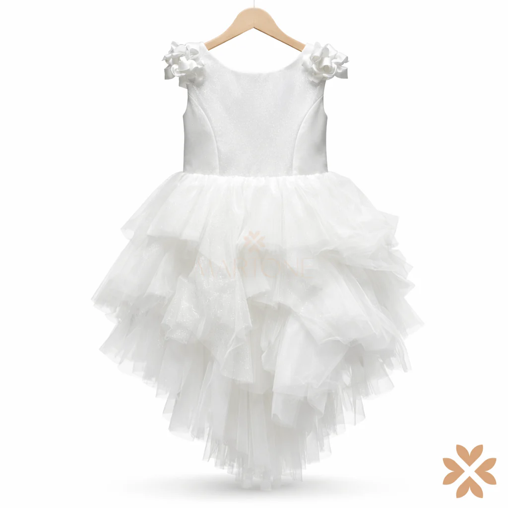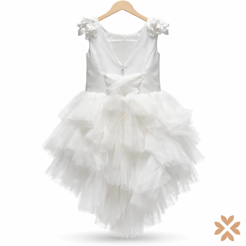 Un abito da cerimonia che unisce eleganza couture e leggerezza fiabesca. Il corpino in tessuto bianco luminoso, delicatamente puntinato da micro riflessi, presenta una linea pulita sul davanti ed è impreziosito da romantiche applicazioni floreali sulle spalle che donano volume e carattere. Sul retro, la scollatura più profonda con zip centrale aggiunge un dettaglio raffinato […]