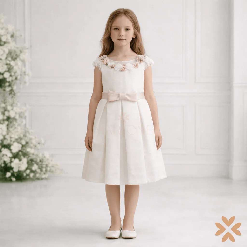 Abito da cerimonia per bambina dallo stile essenziale e raffinato, realizzato in elegante tonalità avorio. Il design è valorizzato da un corpino pulito con scollo arrotondato, impreziosito da delicati fiori applicati lungo il girocollo che donano un tocco romantico e distintivo.