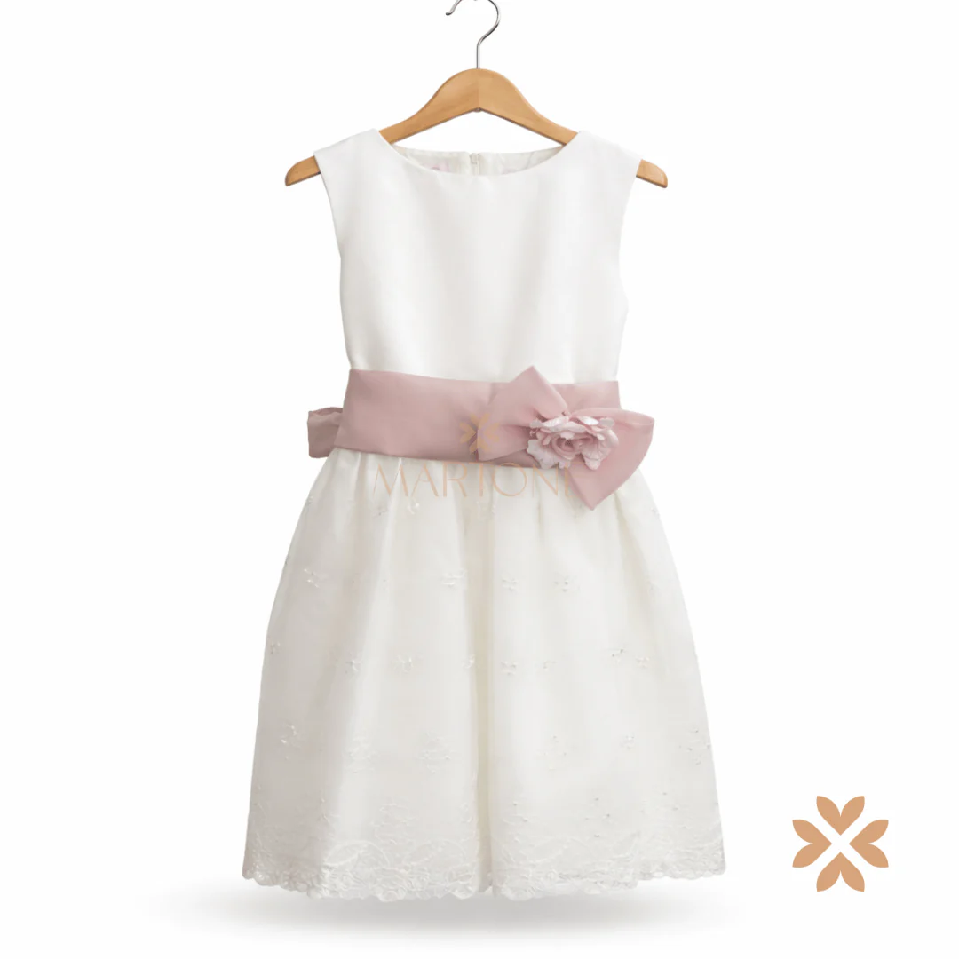 Abito da cerimonia per bambina realizzato con corpetto in tessuto satinato dalla linea pulita e scollo tondo. Il punto vita è valorizzato da una fascia in tonalità rosa cipria impreziosita da un fiocco strutturato con applicazione floreale. Gonna ampia con delicati ricami floreali tono su tono e bordo finale rifinito in pizzo ricamato. Chiusura posteriore con zip invisibile. Ideale per comunioni, cerimonie ed eventi eleganti.