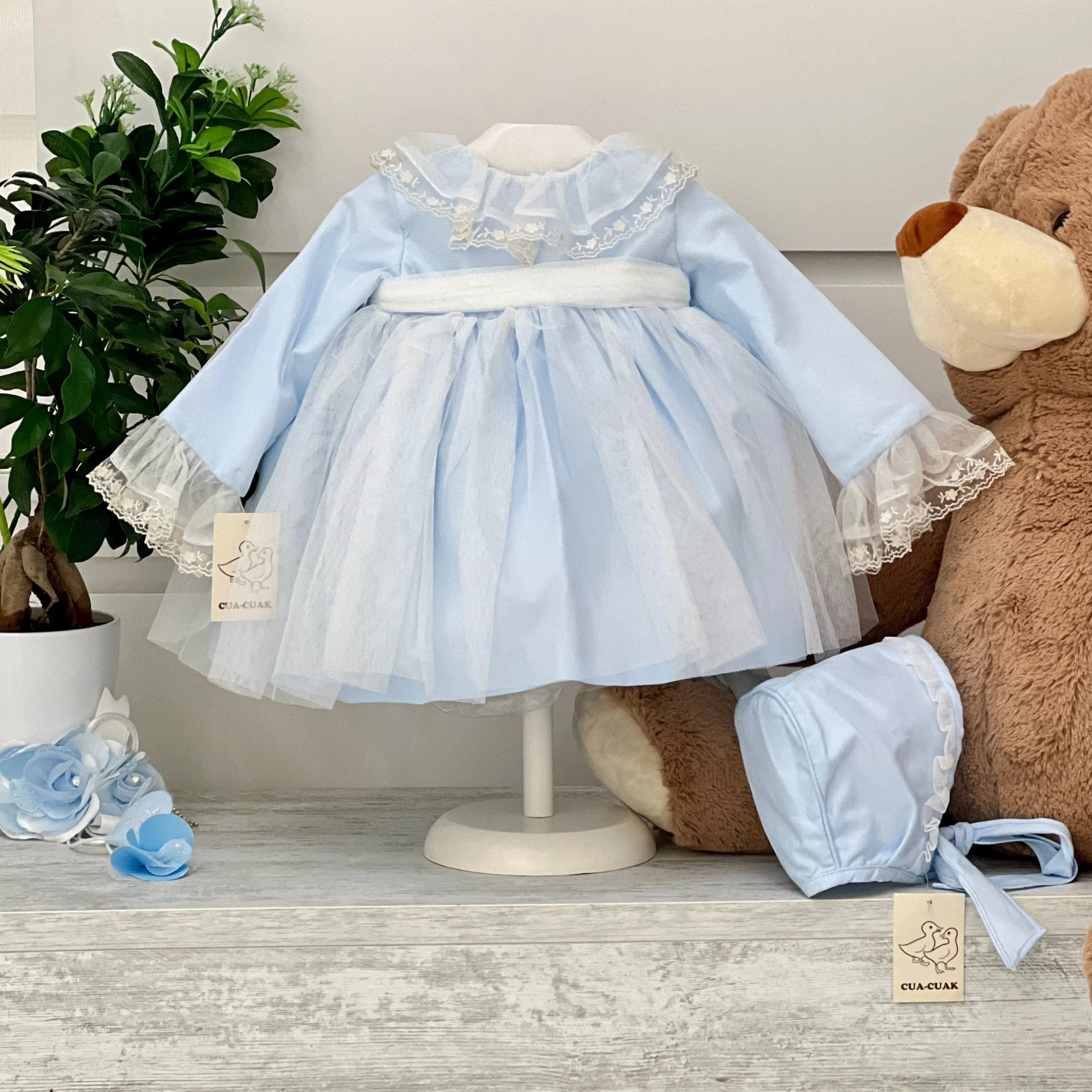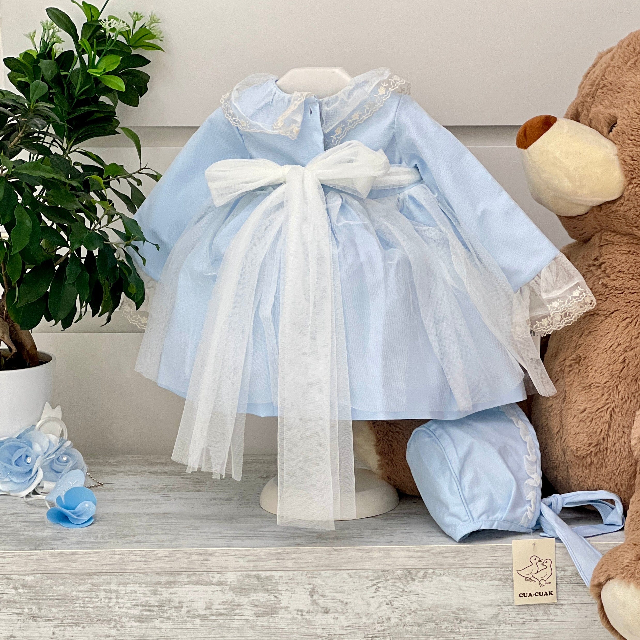 Abito elegante modello bambolina, rifinito in tulle e pizzo. NB: cuffia non inclusa nel prezzo SKU: 3125