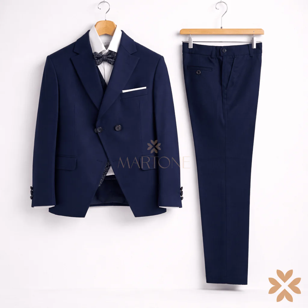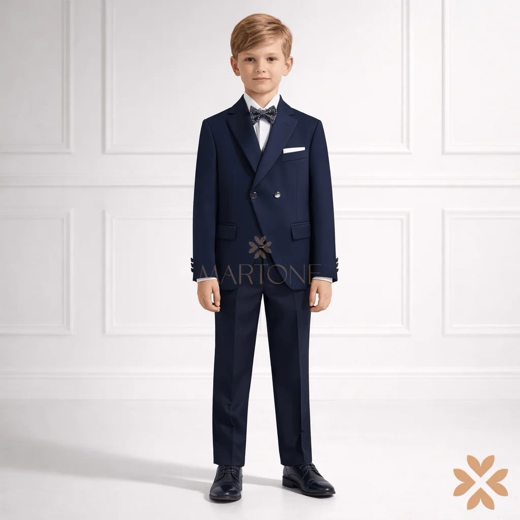 Abito da comunione da bambino in blu navy, composto da giacca sartoriale doppiopetto, pantalone lungo coordinato, camicia bianca e papillon abbinato. Linea pulita e struttura impeccabile, con rever classici, taschino a filetto e bottoni a contrasto per una finitura di grande carattere. Vestibilità ordinata ed equilibrata, per un look formale raffinato e senza tempo, ideale per una Prima Comunione dallo stile tradizionale e impeccabile.