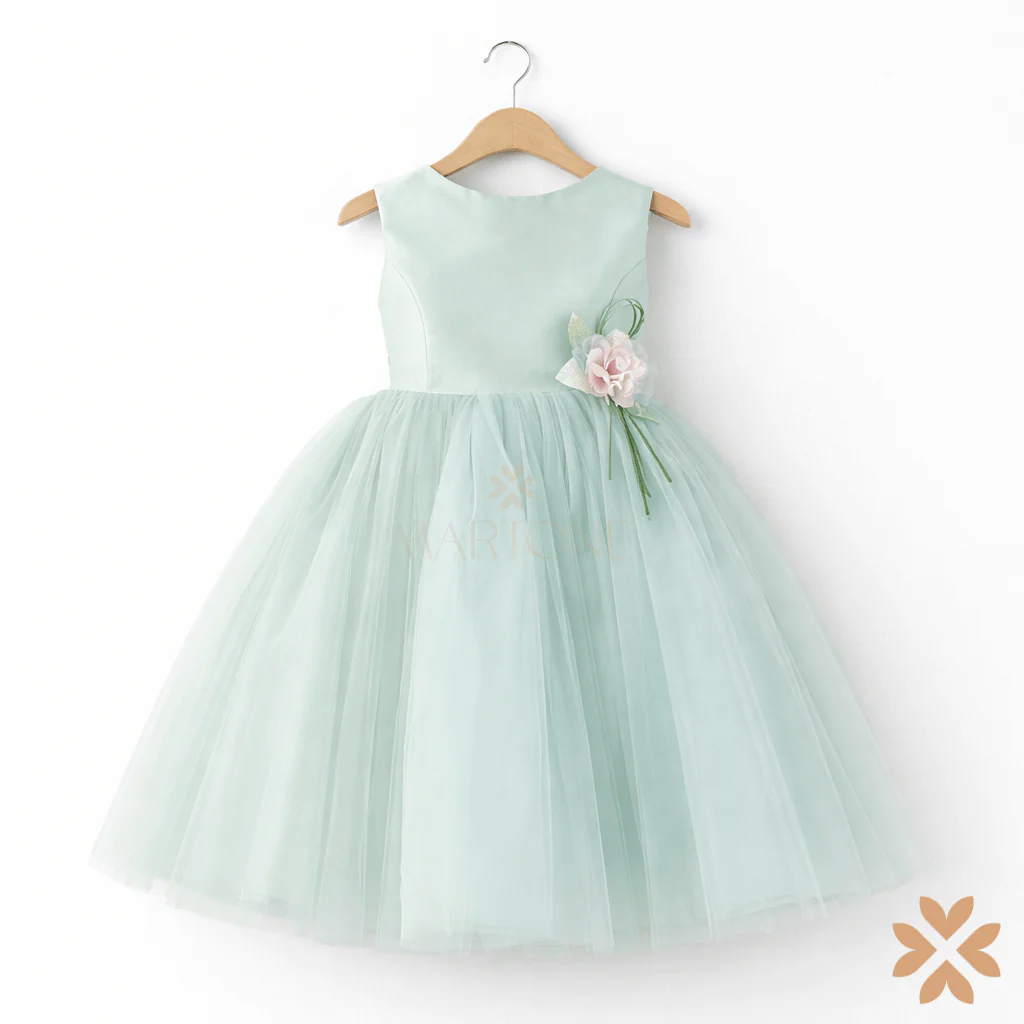 Abito damina composto da gonna in tulle, corpetto in mikado e cintura con fiocco sul retro con dettaglio floreale.