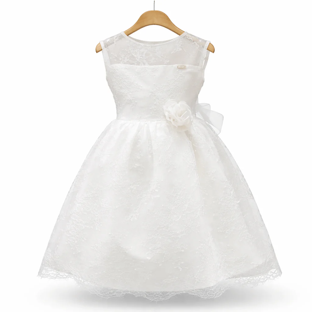 Abito cerimonia lavorato interamente in pizzo, con manica a giro e fiocco posteriore in organza.