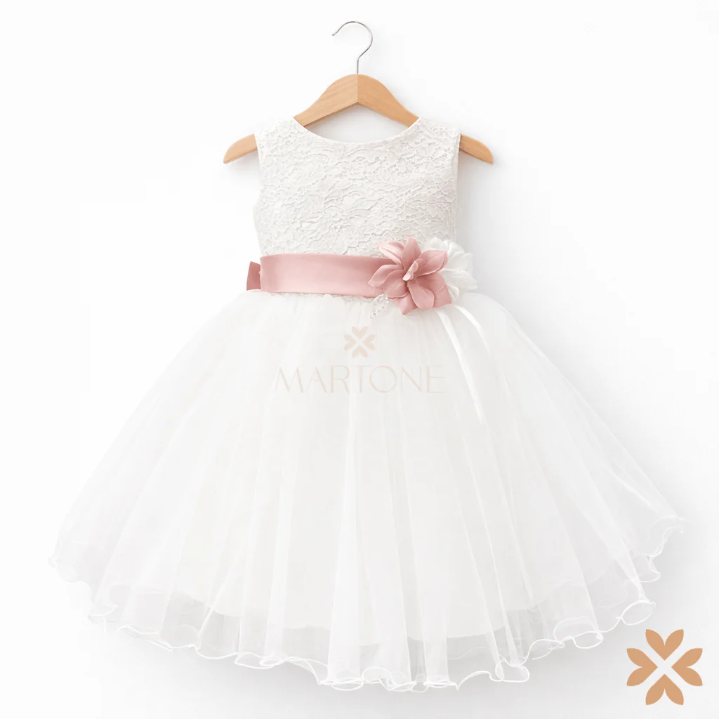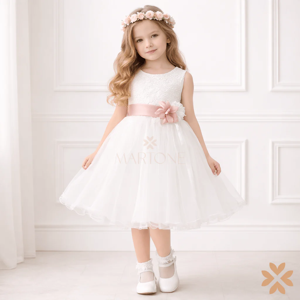Abito da cerimonia con gonna in organza in seta e corpetto in merletto. Scollo sul retro a punta e cintura in taffetà con fiocco, completata con appliques floreali in vita.