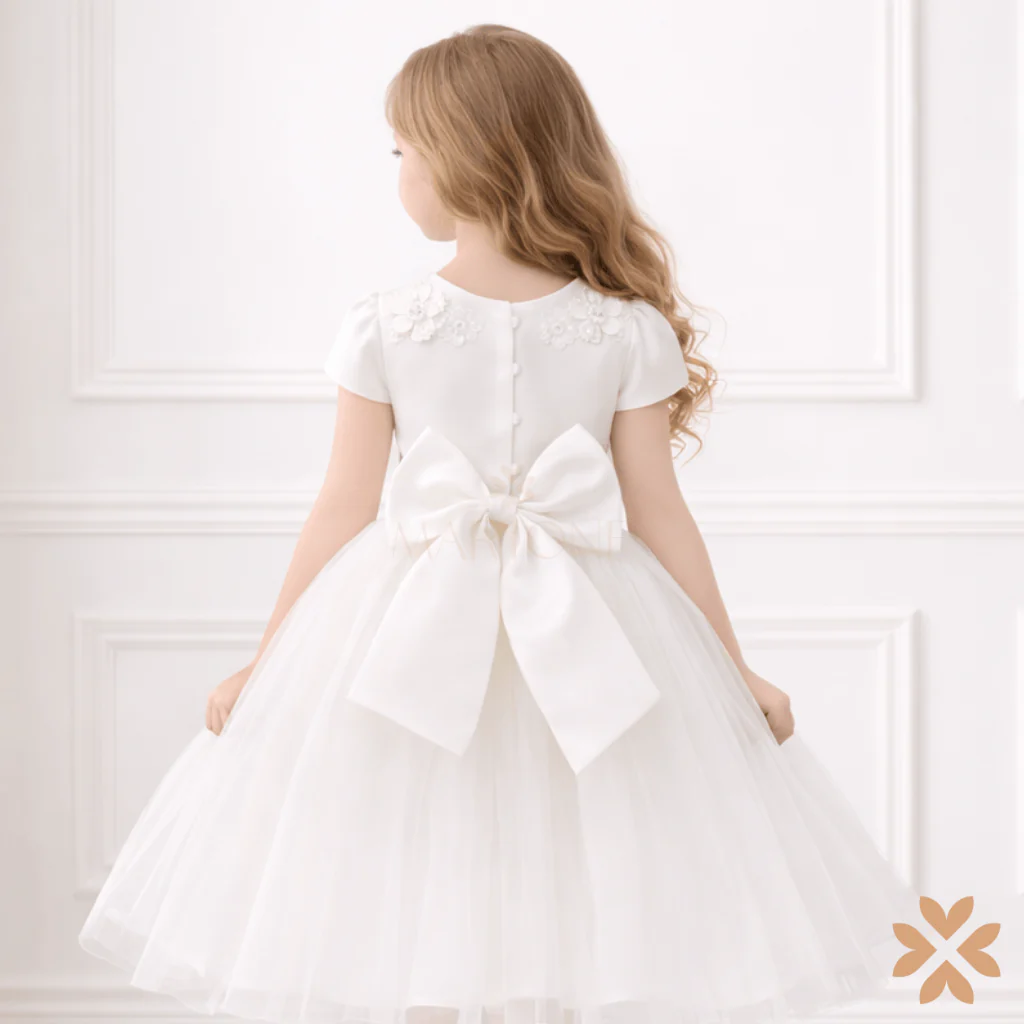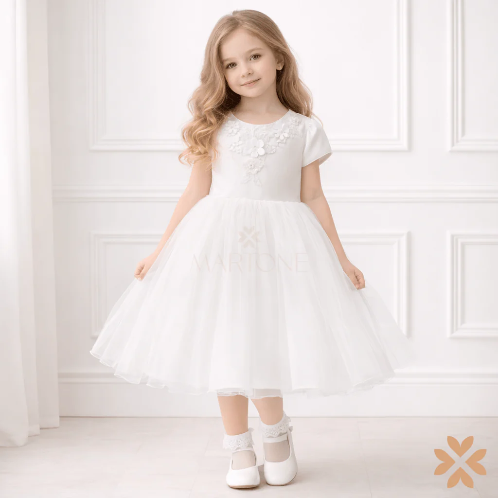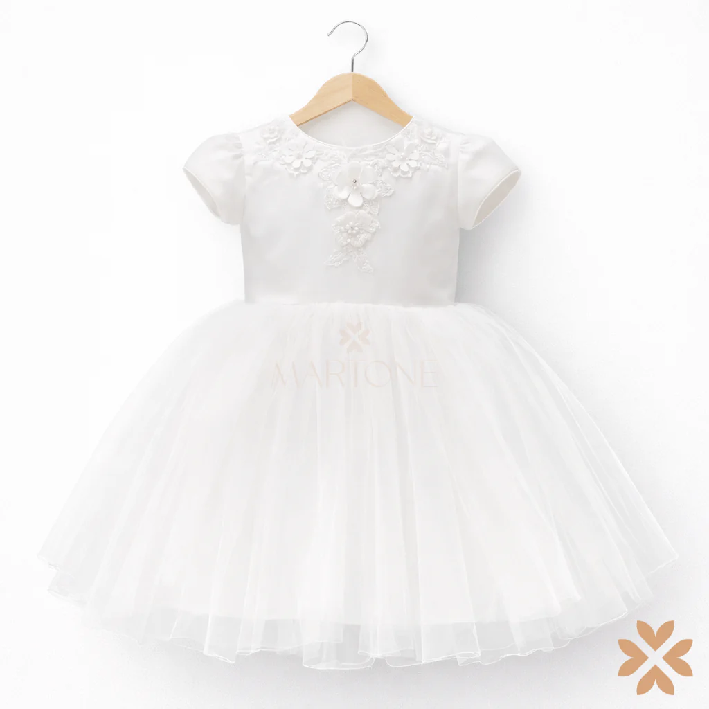 Abito domina con gonna in tulle, corpetto con manica corta ed applicazioni floreali in 3D