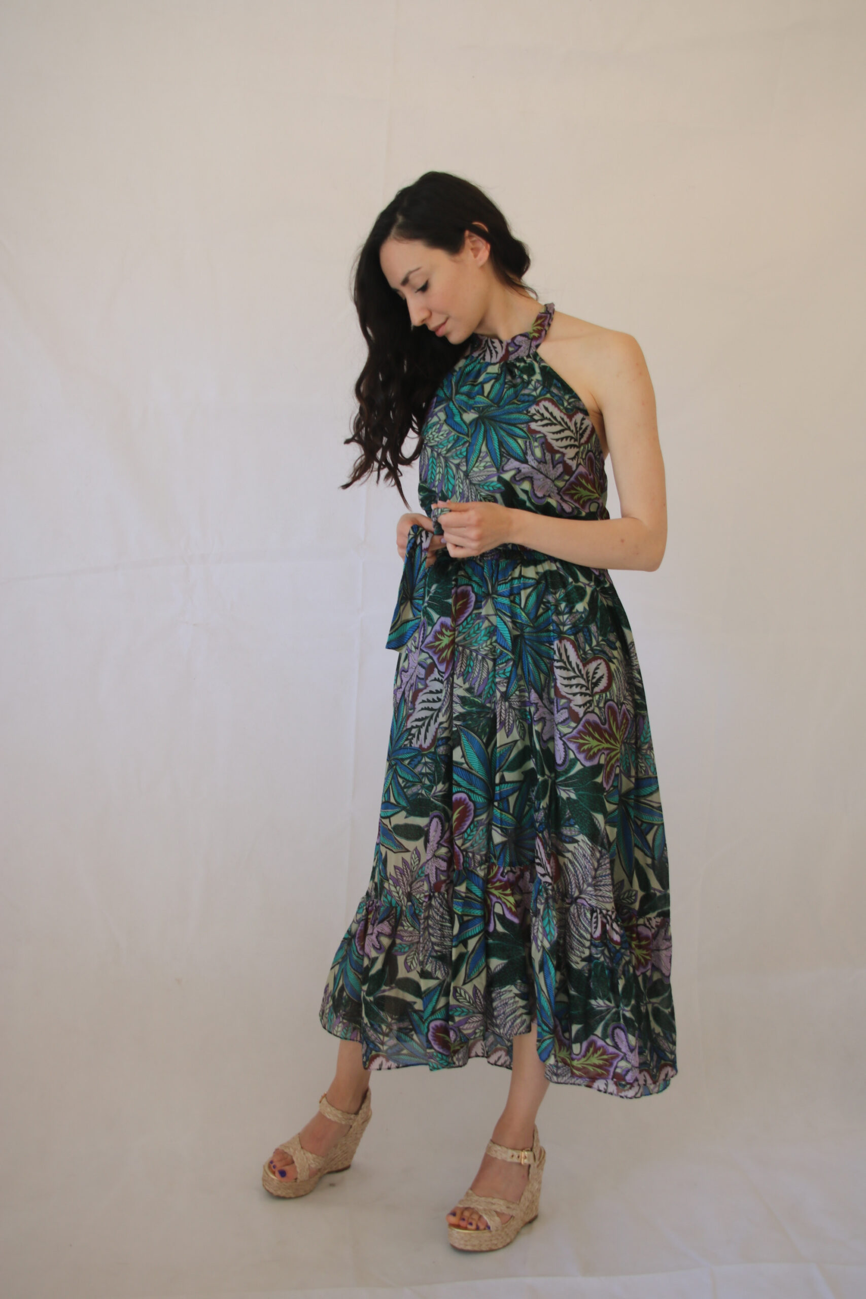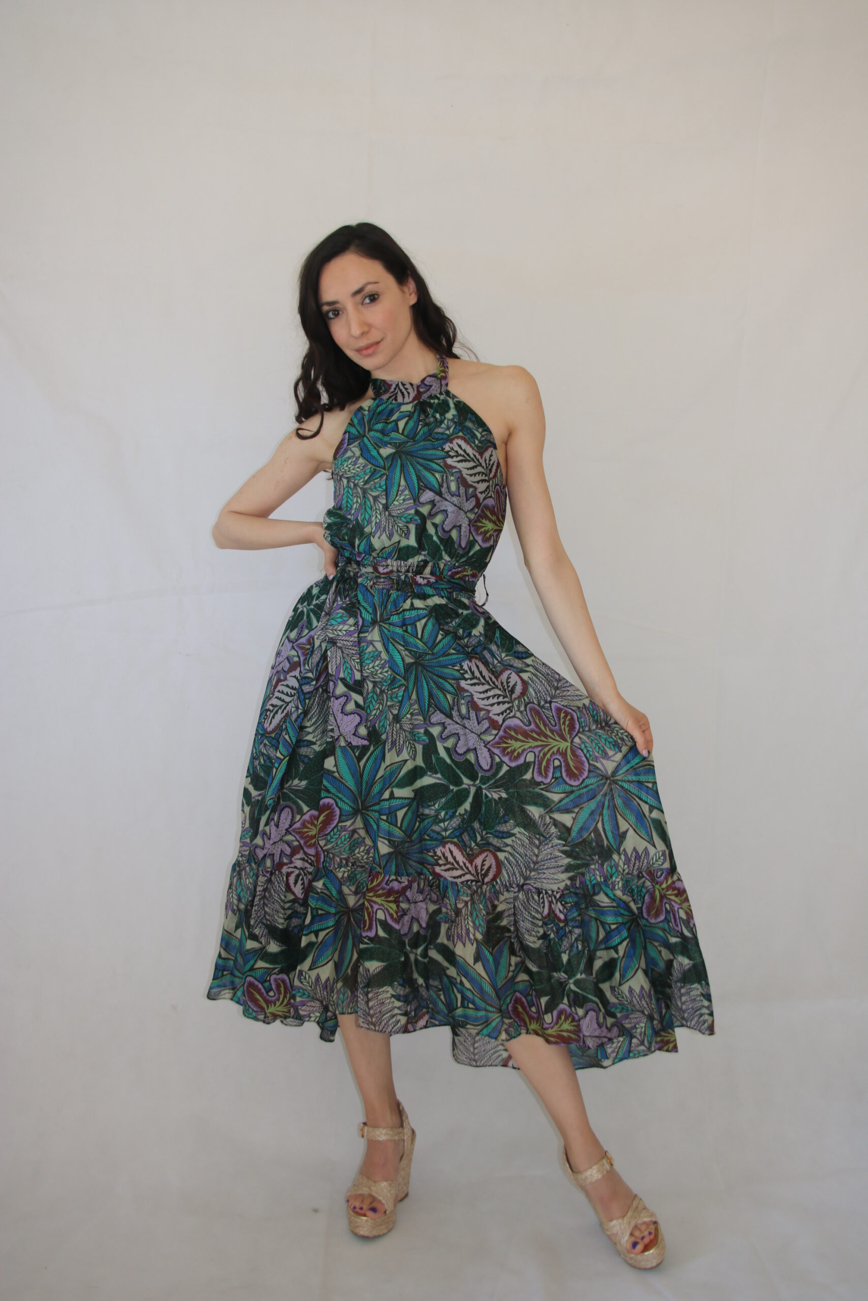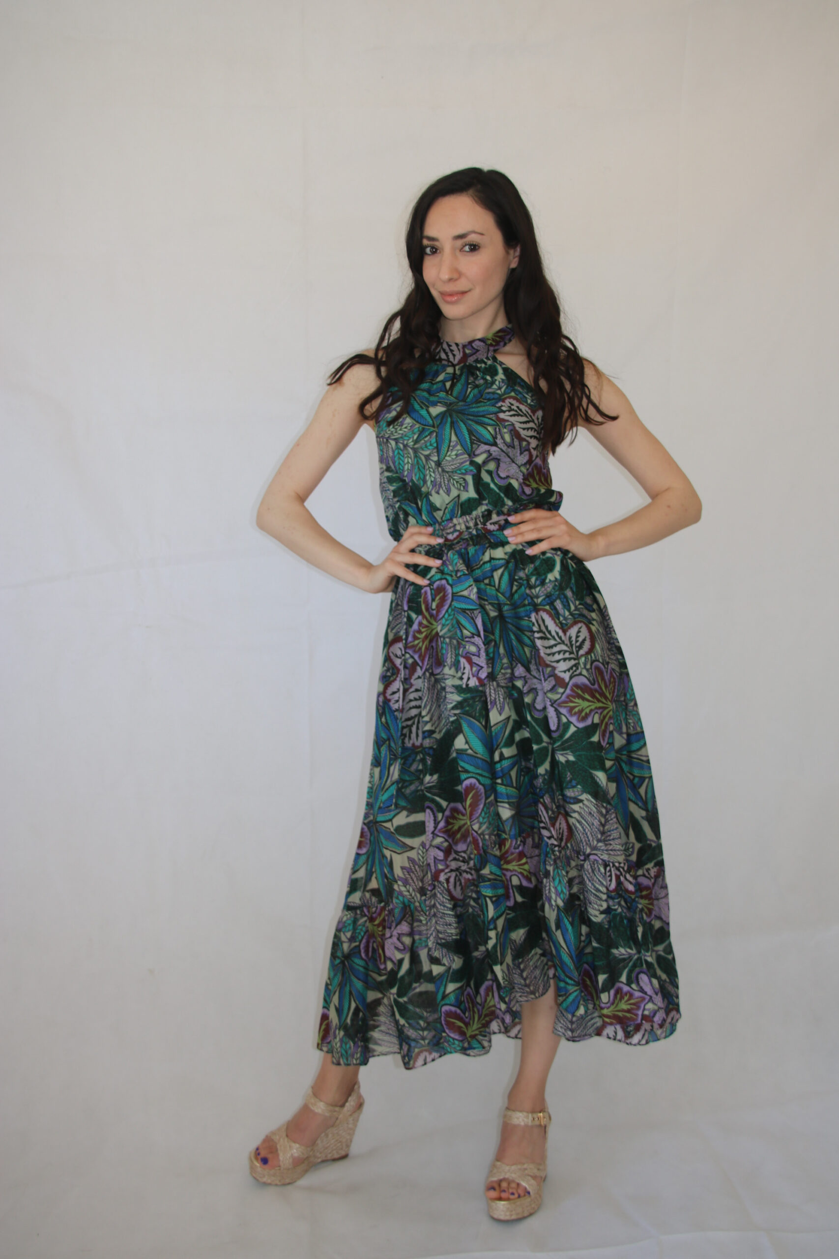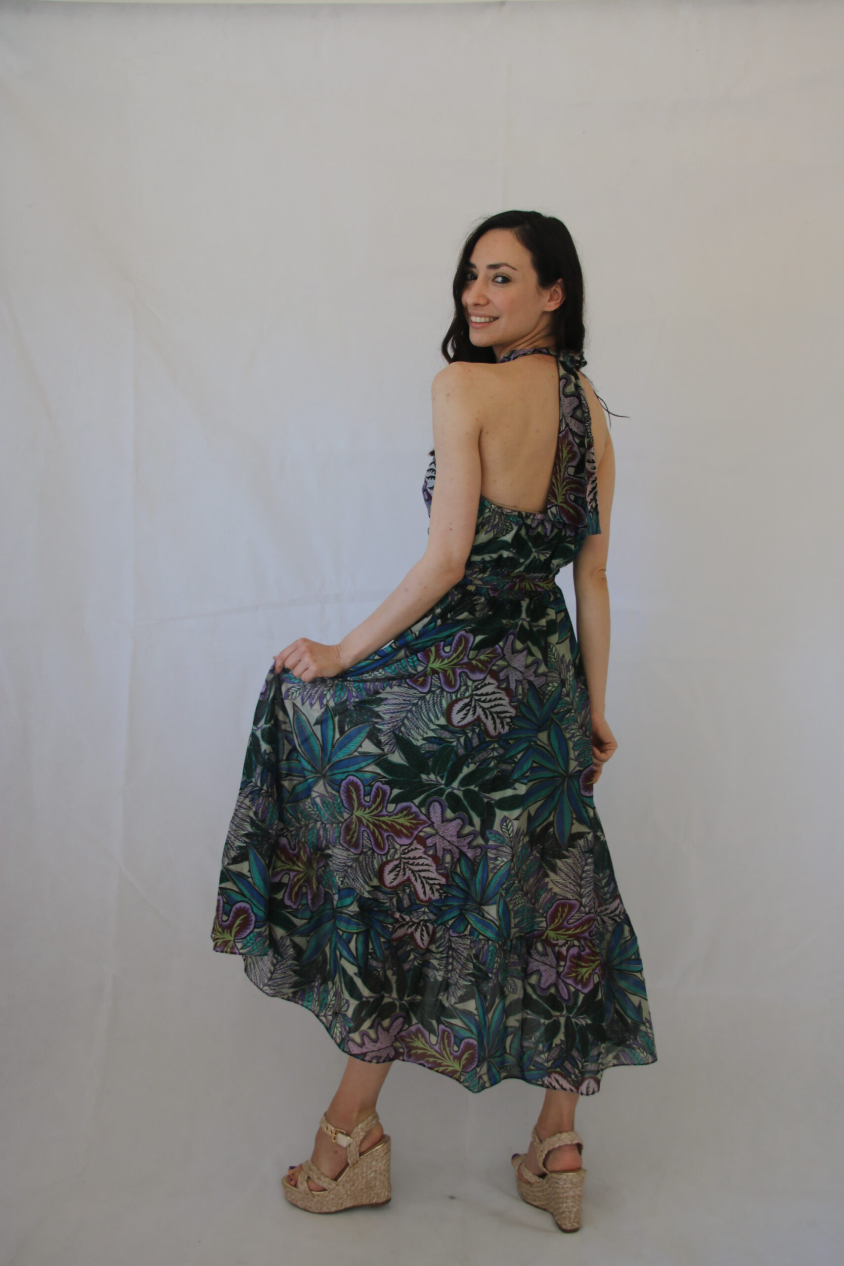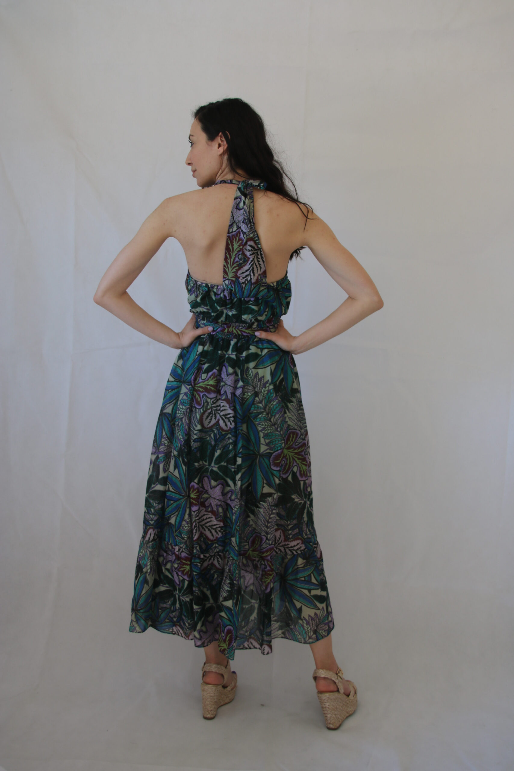 Collo all’americana ed elastico che adatta al busto perfettamente l’abito.