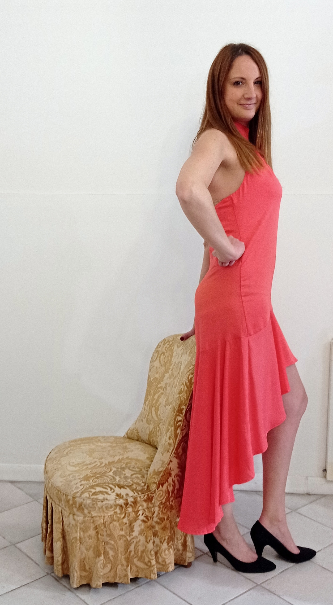 Splendido colore corallo e schiena scoperta.