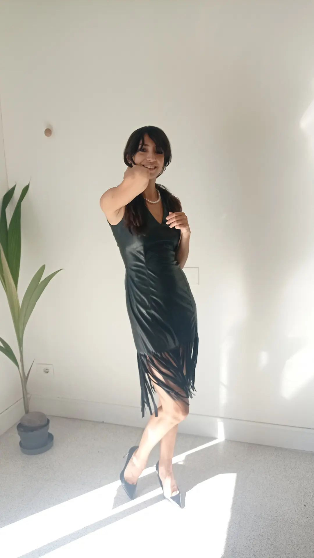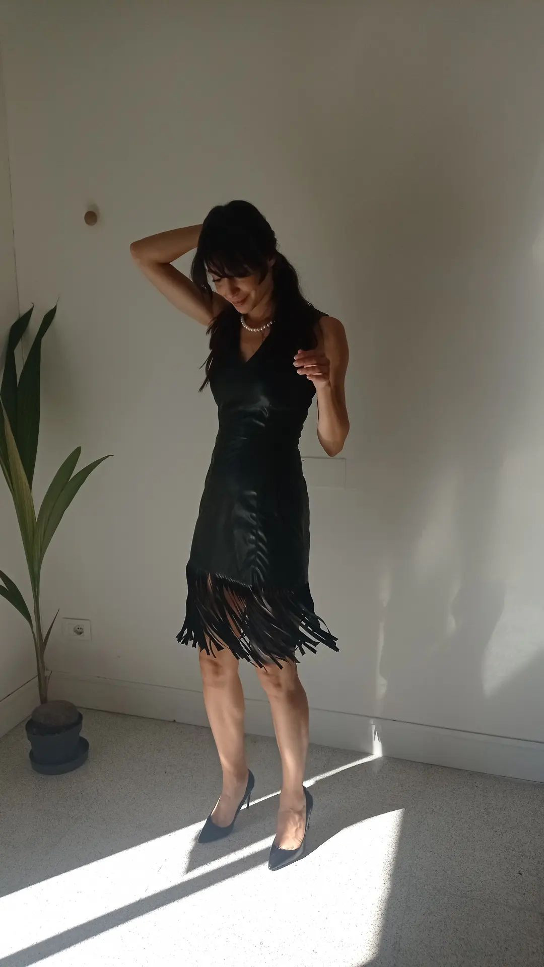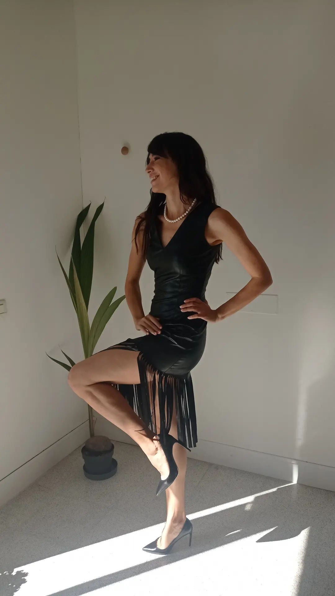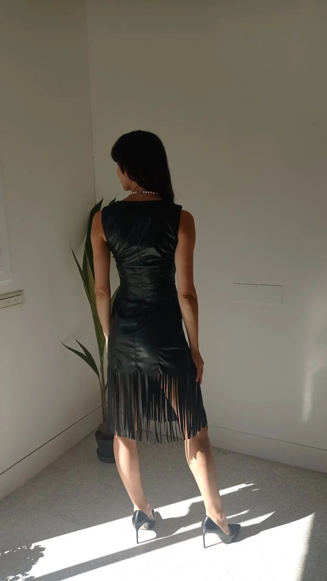 Morbidissima pelle ecologica per questo abito con frange molto femminile e potente.
